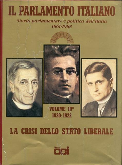 XIX, 456 p. : ill. ; 31 x 23 cm. Sommario: Cronologia storico-parlamentare 1920-1922; La crisi dello stato liberale; Il "biennio rosso" e il dibattito interno al movimento operaio; I governi Nitti e Giolitti; I popolari tra collaborazione e opposizione: La crisi del Parlamento e l'avvento del fascismo. I protagonisti del Parlamento: Luigi Sturzo; Antonio Gramsci; Giacinto Menotti Serrati; Giuseppe Micheli; Luigi Federzoni; Luigi Facta; Giovanni Amendola; Giulio Alessio. Bibliografia; Gli autori del decimo volume; Elenco dei senatori e deputati della XXVI Legislatura; Indice dei nomi e dei luoghi; Indice iconografico. Contiene due schede biografiche su Francesco Saverio Merlino e Errico Malatesta. Legatura editoriale, coperta in cartone rigido foderato di similpelle di colore rosso scuro (bordò), titolo impresso in oro al piatto e al dorso. Sovraccoperta illustrata a colori in carta patinata lucida. All'interno numerose illustrazioni a colori su carta patinata. Codice libreria 6032.