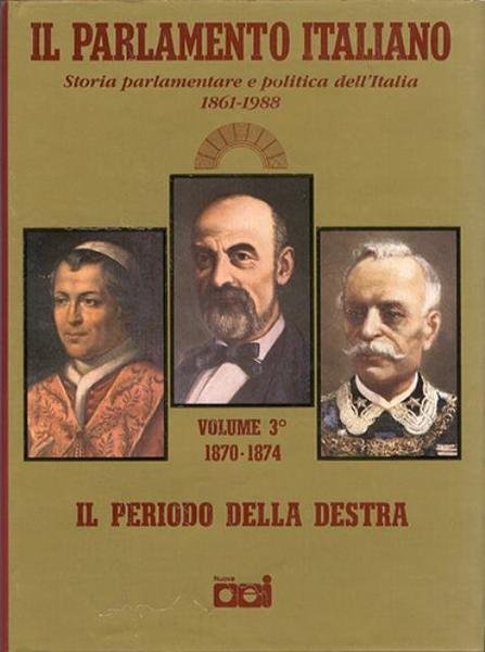 XIX, 550 p. : ill. ; 31 x 23 cm. Sommario: Cronologia storico-parlamentare 1870-1874; Il Parlamento a Roma; L'XI Legislatura e il ministero Lanza; La destra e la questione sociale; La legge delle Guarentigie; L'inchiesta industriale; L'inchiesta Scialoja sull'istruzione secondaria (1872-1874). I protagonisti del Parlamento: Pio IX; Gino Capponi; Giovanni Lanza; Luigi Federico Menabrea; Michele Amari; Luigi Settembrini; Terenzio Mamiani delle Rovere; Ferdinando Petruccelli della Gattina; Giuseppe Pisanelli. Bibliografia; Gli autori del terzo Volume; Elenco dei senatori e deputati della XI e XII Legislatura; indice dei nomi e dei luoghi; Indice iconografico. Legatura editoriale, coperta in cartone rigido foderato di similpelle di colore rosso scuro (bordò), titolo impresso in oro al piatto e al dorso. Sovraccoperta illustrata a colori in carta patinata lucida. All'interno numerose illustrazioni a colori su carta patinata. Codice libreria 6025.