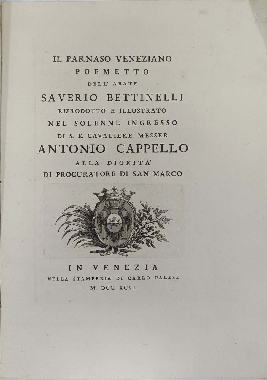 >in-4, pp. (8), 87, legatura originale in cartonato color vinaccia, bordura floreale sui piatti con le armi dei Cappello al centro di quello anter. e lo stemma di Venezia (una doppia V intrecciata) su quello poster., impressi in color violetto. Dedica di Don Jacopo Morellli, "custode della Pubblica Biblioteca" ad Antonio Cappello "cavaliere e Procuratore di San Marco". Magnifico antiporta inc. in rame f.t. con figure allegoriche, vignetta con armi dei Cappello sul frontesp. Bellissimo esempl. di questo poco conosciuto poemetto del Bettinelli (Mantova 1718-1808) nella caratteristica legatura veneziana originale. Cicogna n. 2532. Morazzoni p. 266. Lapiccirella n. 41.