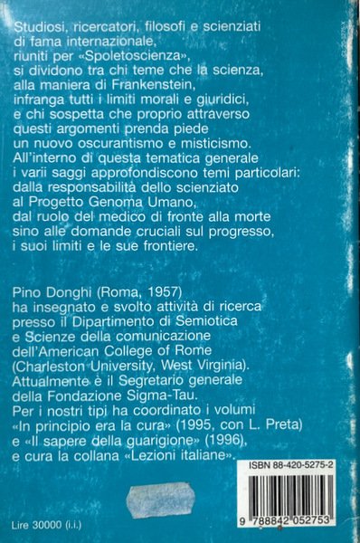 Studiosi, ricercatori, filosofi e scienziati di fama internazionale, riuniti per Spoletoscienza, si dividono tra chi teme che la scienza, alla maniera di Frankenstein, infranga tutti i limiti morali e giuridici, e chi sospetta che proprio attraverso questi argomenti prenda piede un nuovo oscurantismo e misticismo. All'interno di questa tematica generale i varii saggi approfondiscono temi particolari: dalla responsabilità dello scienziato al Progetto Genoma Umano, dal ruolo del medico di fronte alla morte sino alle domande cruciali sul progresso, i suoi limiti e le sue frontiere.