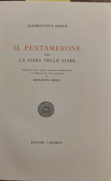 Tradotta dall'antico dialetto napoletano e corredata di note storiche da Benedetto Croce. In 8vo grande, cm. 17x24,5; pag. XXXV (1) + 619 (1), con 1 ritratto in antiporta in nero e 26 illustrazioni a colori fuori testo. Tela editoriale e custodia figurata a colori. Ottima la conservazione. Codice inv.1030974