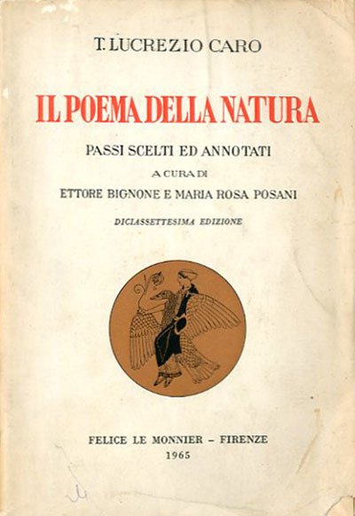 17. ed. L, 153 p. ; 21 x 14 cm. Nel «De rerum natura», pubblicato postumo da Cicerone intorno al 53 a.C., Lucrezio consegna alla posterità una fedele esposizione del materialismo epicureo, fonte essenziale per la riscoperta di questa dottrina a partire dal Quattrocento. Spaziando dall’infinitesimo all’infinito, il poeta ripercorre nei termini della fisica atomistica la genesi dell’universo e la storia dell’umanità. Ma soprattutto canta il coraggio intellettuale di Epicuro e la sua filosofia liberatrice, capace di emancipare l’uomo da desideri vani, false superstizioni, paure infondate, prime fra tutte l’angoscia della morte e il timore degli dei. Il poema si apre con una invocazione a Venere, simbolo della voluptas, l’energia genitrice che pervade la natura, e si chiude con la descrizione della peste di Atene: vita e morte sono i due poli dialettici non solo della realtà, ma anche della poetica di Lucrezio che sottopone la materia filosofica a una forte tensione emotiva e immaginativa. Filtrato da una dolente coscienza della condizione umana, il razionalismo epicureo assume in Lucrezio accenti drammatici, specchio dei suoi tormenti di genio solitario della letteratura latina. A cura di Ettore Bignone e Maria Rosa Posani. Brossura editoriale, coperta in cartoncino flessibile con impresso il titolo al piatto e al dorso, illustrata a colori. Qualche segno del tempo alla coperta, ai profili e al taglio per il resto esempl. accettabile, da studio. Codice libreria 5482.