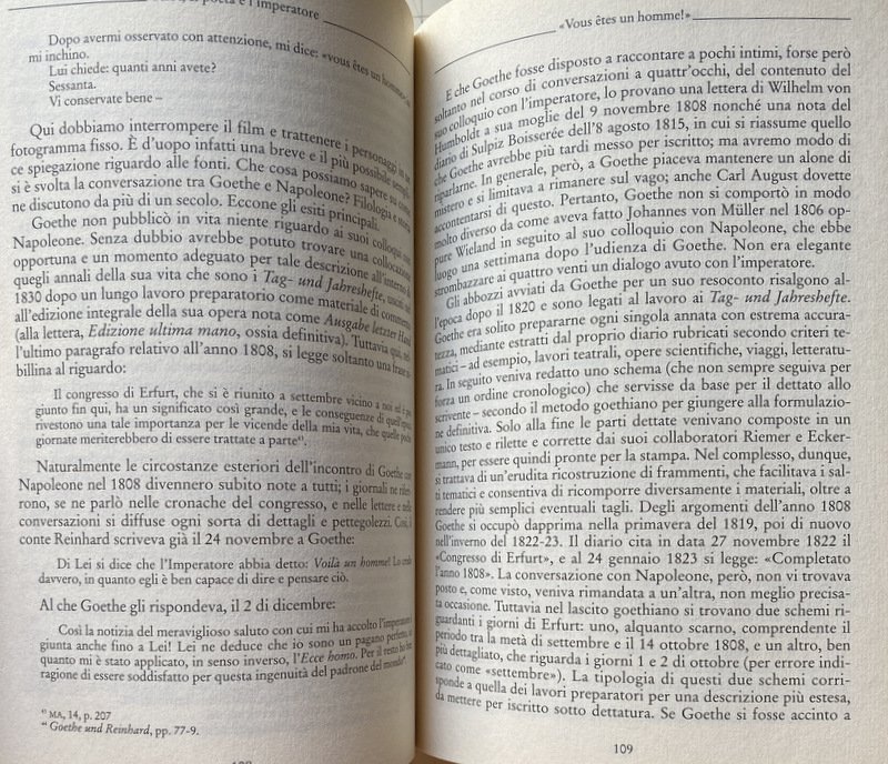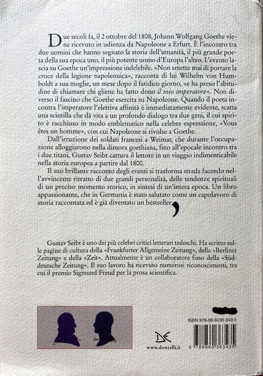 Due secoli fa, il 2 ottobre del 1808, Johann Wolfgang Goethe viene ricevuto in udienza da Napoleone a Erfurt. È l'incontro tra due uomini che hanno segnato la storia dell'umanità, il più grande poeta della sua epoca uno, il più potente uomo d'Europa l'altro. L'evento lascia su Goethe un'impressione indelebile. «Non smette mai di portare la croce della legione napoleonica», racconta di lui Wilhelm von Humboldt a sua moglie, un mese dopo il fatidico giorno, «e ha preso l'abitudine di chiamare chi gliene ha fatto dono il mio imperatore». Non diverso il fascino che Goethe esercita su Napoleone. Quando il poeta incontra l'imperatore l'elettiva affinità è immediatamente evidente, scatta una scintilla che dà vita a un profondo dialogo tra due geni, il cui spirito è racchiuso in modo emblematico nella celebre espressione, «Vous êtes un homme», con cui Napoleone si rivolse a Goethe.