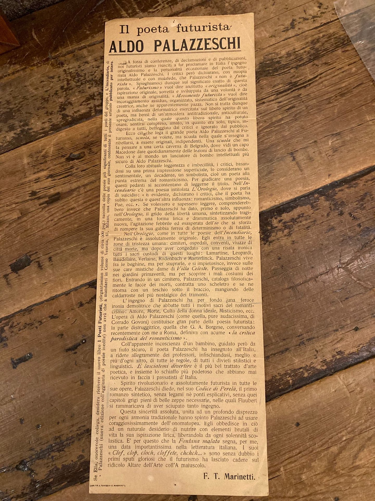 Manifesto futurista in-4° verticale stretto (42x14 cm), stampato al solo recto, ripiegato. Alcune lievi segni di lettura e sottolineature a lapis blu. Minimi difetti marginali ma più che buon esemplare. Edizione originale di questo schizzo recensivo sull' originalità dello scrivere di Aldo Palazzeschi e sull' ottusità della critica lettteraria uscito nel marzo del 1913 pubblicato in occasione della seconda edizione de L'incendiario (Edizioni futuriste di poesia, 1913). Venne anche pubblicato su 'La tavola rotonda'. Anno XXIII n.18. 1 giugno 1913- Cfr. Tonini, I manifesti, 57.1; Cammarota, Marinetti (Volantini, 23).
