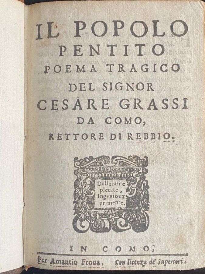 <span style="font-style: normal;"><span style="font-style: normal;">In-8° (cm. 14,7), legatura del XX secolo in piena pelle con titolo in oro al dorso; pp. [32] 160 [16] in buono stato, con dedica al vescovo di Como mons. Lazzaro Caraffini, vari sonetti dedicati all'autore e un giudizio sull'opera del monaco Pio Rossi. </span></span>Edizione originale di particolare rarità, non censita in SBN.<span style="font-style: normal;"><span style="font-style: normal;"> Il sacerdote comasco Grassi, rettore di Rebbio, racconta qui in forma letteraria i mali del suo tempo, verità storiche e lugubri avvenimenti, con l'intenzione di suscitare il pubblico pentimento. Cesare Cantù cita quest'opera in </span><i>Il Sacro Macello di Valtellina</i> (p. 66) laddove riprende notizie sulla terribile tortura e il vilipendio del cadavere dell'arciprete Nicolò Rusca. Cfr. Giovio, </span><i>Gli uomini della comasca diocesi</i>, 382. Buon esemplare. (SG5)