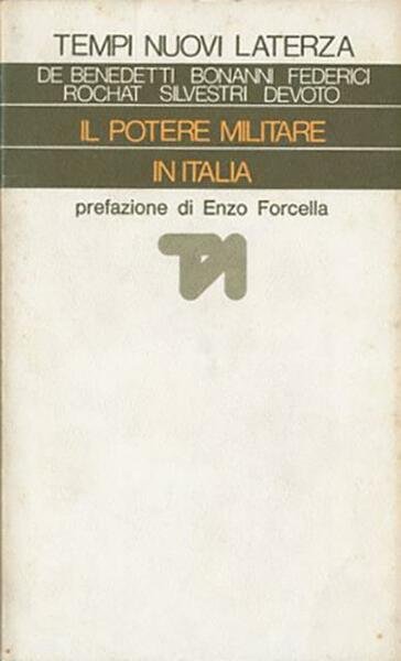 3. ed. XXII, 277 p. ; 18 x 11 cm. Tempi nuovi, 43. Esiste un "potere militare" in Italia? Come si manifesta, quali sono le sue tradizioni, quali obiettivi persegue? Quali sono i suoi rapporti con il potere politico, con l'industria, con i comandi della NATO? Sociologici, storici, studiosi militari rispondono in questo volume ad uno dei più inquietanti interrogativi che gli anni sessanta ci hanno lasciato. Prefazione di Enzo Forcella. Questa antologia contiene saggi di F. De Benedetti, G. Rochat, M. Bonanni, S. Silvestri, C. Federici e G.L. Devoto. Brossura editoriale, coperta colorata in cartoncino flessibile. Tracce del tempo alla copertina, firma di appartenenza nel frontespizio, per il resto esemplare integro. Codice libreria 7781.