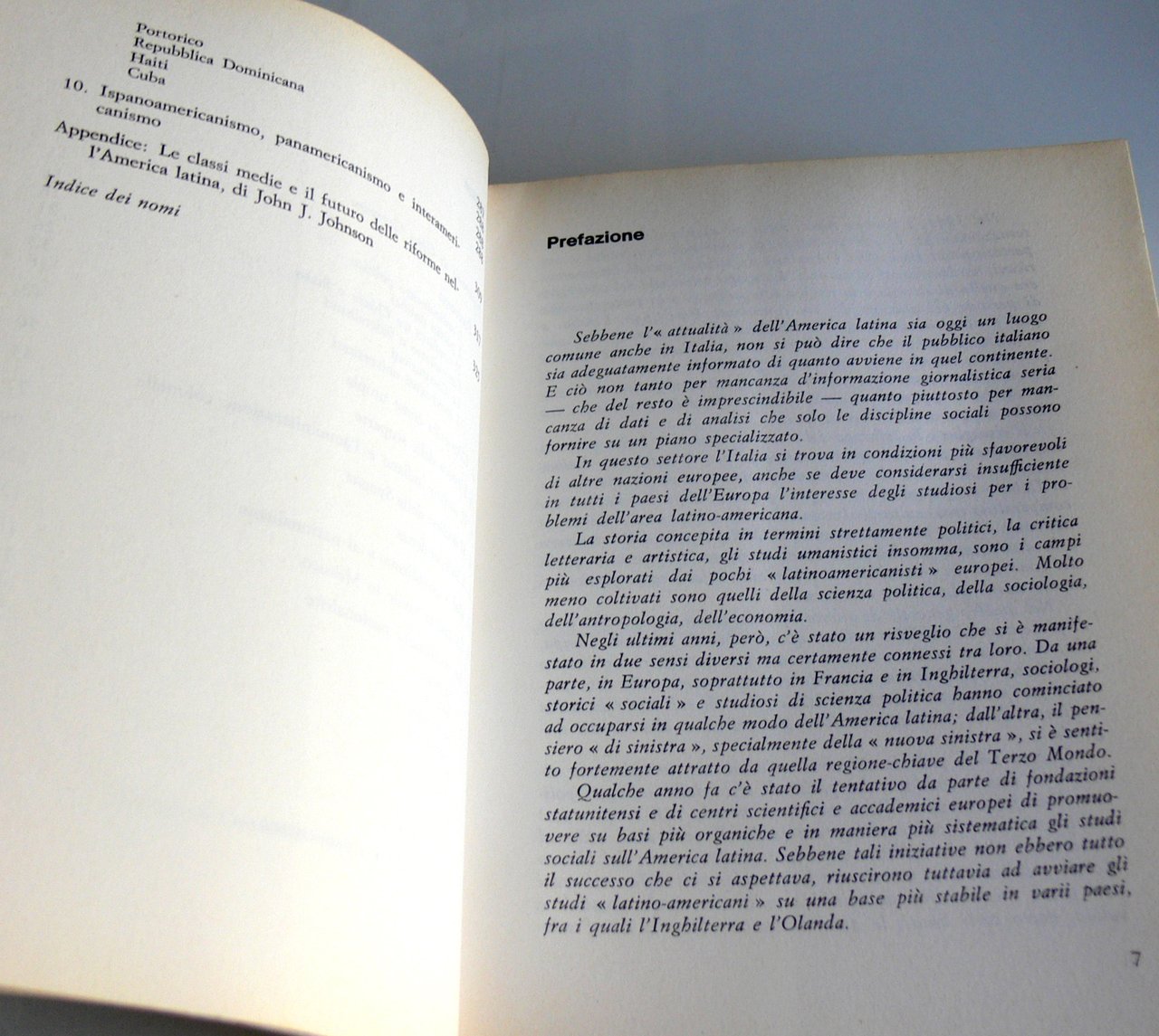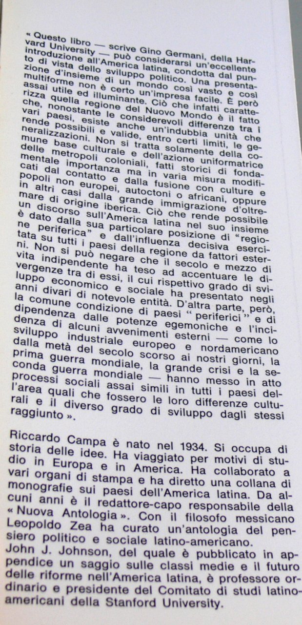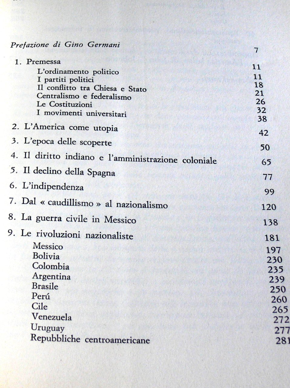 Questo libro, scrive Gino Germani, della Harvard University può considerarsi un'eccellente introduzione all'America latina, condotta dal punto di vista dello sviluppo politico. Una presentazione d'insieme di un mondo così vasto e cosi multiforme non è certo un'impresa facile. E però assai utile ed illuminante. Ciò che infatti caratterizza quella regione del Nuovo Mondo è il fatto che, nonostante le considerevoli differenze tra i vari paesi, esiste anche un'indubbia unità che rende possibili e valide, entro certi limiti, le generalizzazioni. Non si tratta solamente della comune base culturale e dell'azione uniformatrice delle metropoli coloniali, fatti storici di fondamentale importanza ma in varia misura modificati dal contatto e dalla fusione con culture e popoli non europei, autoctoni o africani, oppure in altri casi dalla grande immigrazione d'oltremare di origine iberica. Ciò che rende possibile un discorso sull'America latina nel suo insieme è dato dalla sua particolare posizione di regione periferica e dall'influenza decisiva esercitata su tutti i paesi della regione da fattori esterni. Non si può negare che il secolo e mezzo di vita indipendente ha teso ad accentuare le divergenze tra di essi, il cui rispettivo grado di sviluppo economico e sociale ha presentato negli anni divari di notevole entità. D'altra parte, però, la comune condizione di paesi periferici e di dipendenza dalle potenze egemoniche e l'incidenza di alcuni avvenimenti esterni sviluppo industriale europeo e nordamericano come lo dalla metà del secolo scorso ai nostri giorni, la prima guerra mondiale, la grande crisi e la seconda guerra mondiale hanno messo in atto processi sociali assai simili in tutti i paesi dell'area quali che fossero le loro differenze culturali e il diverso grado di sviluppo dagli stessi raggiunto.