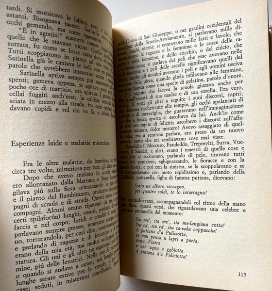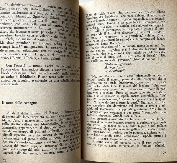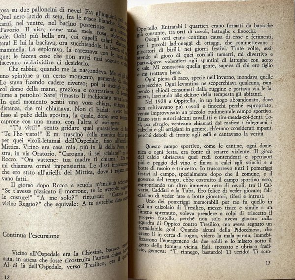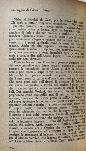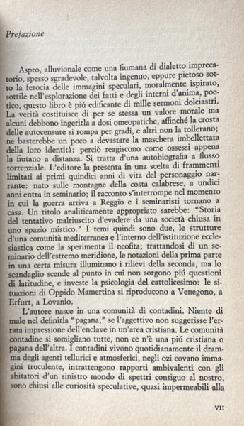 Soggetti: Letteratura italiana, Anni Settanta, Scandali letterari, Romanzi, Gialli, Omicidi, Delitti, Erotismo, Sessualità, Sensualità, Relazioni Autobiografie, Bambini, Racconti, Calabria, Italia del Sud, Preti, Vocazione, Libertà, Libertinaggio, Istinti, Desideri, Pulsioni, Religione, Confessione, Sociologia, Archetipi, Carne, Piacere, Sesso, Tentazioni, Giovani, Istinto primordiale, Infanzia, Religione, Rituali, Feste, Cerimonie, Tradizioni culturali, Criminalità, Iniziazione, Arretratezza, Peppinello, Fascismo, Animalità, Sussistenza, Famiglia calabrese, Donne, Biografie, Memorie, Libri Vintage Fuori catalogo, Superstizione, Magia, Stato, Malgoverno, Scrittori calabresi, Italia miserabile, Miseria, Fatiscenza, Arcaismo, Glossarietto, Chierichetto, Seminarista, Sacerdozio, Paganesimo, Animismo, Natura umana, Ruderi, Cattedrali, Palazzi nobiliari, Palazzaccio del Grillo, Nuzzarello, Dialetto, Linguaggio, Nuzzo, Italian literature, Seventies, Literary scandals, Novels, Murders, Crimes, Eroticism, Sexuality, Sensuality, Autobiographical relations, Children, Stories, Southern Italy, Priests, Vocation, Freedom, Libertinage, Instincts, Desires, Drives, Religion, Confession, Sociology, Archetypes, Flesh, Pleasure, Sex, Temptations, Young people, Primal instinct, Childhood, Religion, Rituals, Parties, Ceremonies, Cultural traditions, Crime, Initiation, Backwardness, Fascism, Animality, Subsistence, Calabrian family, Women, Biographies, Memories, Out of print books, Superstition, Magic, State, Misgovernment, Calabrian writers, Italy miserable, Misery, Crumbling, Archaism, Glossary, Altar boy, Seminarian, Priesthood, Paganism, Animism, Human nature, Ruins, Cathedrals, Palaces, Dialect, Language