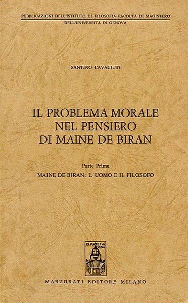 180 p. ; 24 x 15 cm. Pubblicazioni dell'Istituto di filosofia. Facoltà di magistero dell'Università di Genova. Monografia sulla concezione della morale del filosofo e psicologo francese Marie-François-Pierre Gonthier de Biran (1766-1824), più conosciuto come Maine de Biran. Brossura editoriale, copertina in cartoncino flessibile di colore marrone, con titolo impresso al piatto e al dorso. Codice libreria 4251.