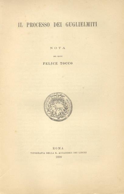 Testo latino. Estratto dai "Rendiconti della R. Accademia dei Lincei. Classe di Scienze Morali, Storiche e Filologiche", Vol.VIII, Ferie Accademiche 1899. Cm.24x15,5. Pg.132. Coperta muta. Il processo inquisitorio a carico dei seguaci della mistica Guglielma di Milano (prima metà XIII secolo – Milano, 24 agosto 1281), oblata che dette vita ad un movimento religioso, chiamato dei Guglielmiti, collegato all'abbazia di Chiaravalle e alla domus umiliata di Biassono in Milano, represso appunto dall'inquisizione nel 1300. > Tre copie in SBN al 2 dicembre 2023. Codice libreria 118940.