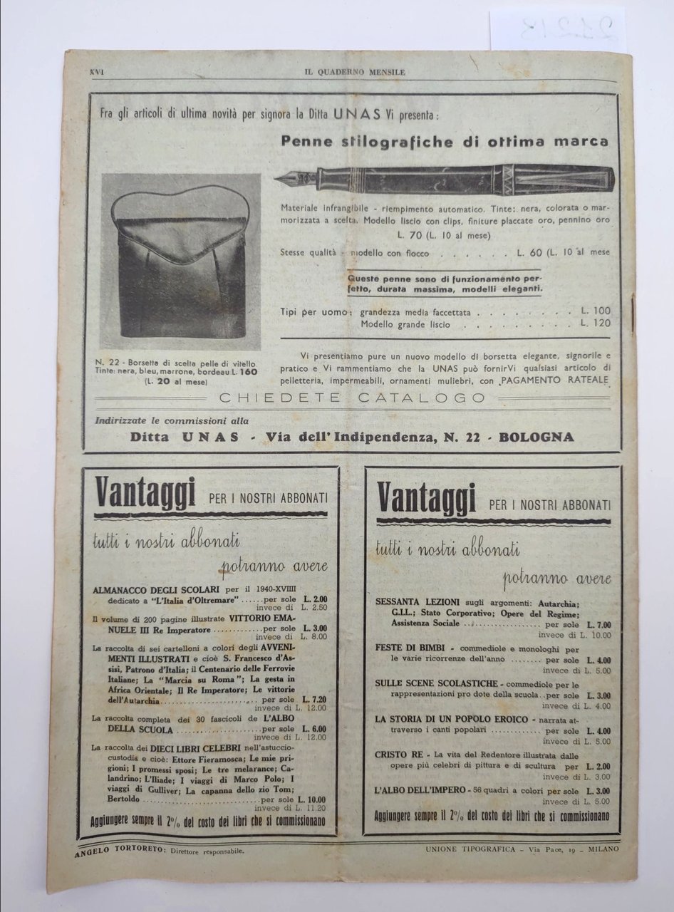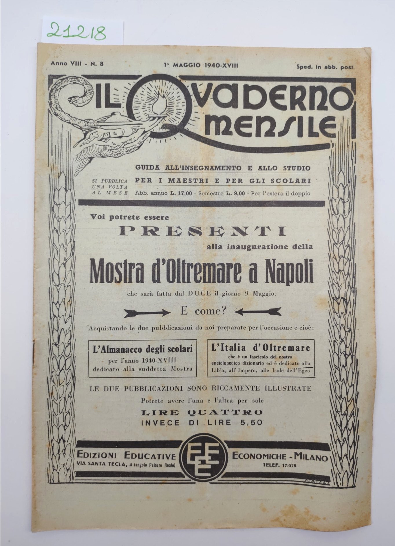 Il quaderno mensile n. 8 1940 guida all'insegnamento e allo studio per i maestri per gli scolari Edizioni Educative Economiche