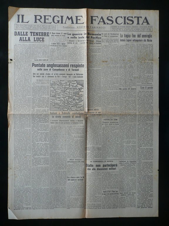 Giornale, Il Regime Fascista" Anno XXIX - Numero 199 Venerdì 22 Ottobre 1943 Cremona 1943, cm 58x42, pp. 2 con una ill. in b/n n. t. Numero completo. Condizioni di conservazione Esemplare in buone condizioni con tracce d'uso, normali pieghe di conservazione, poche minuscole bruniture e normali lievi ingialliture della carta in corrispondenza delle pieghe; margini con poche minime mancanze e un paio di piccoli strappetti; due angoli con una leggera traccia di pieghetta. Numero completo. SC03.D10102 N "