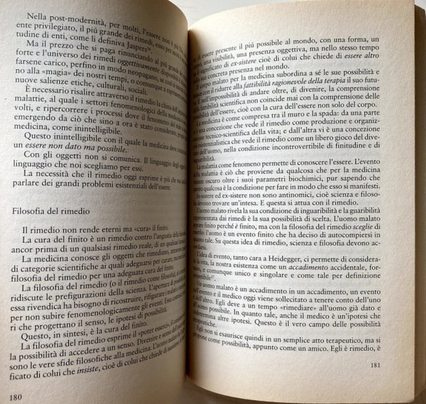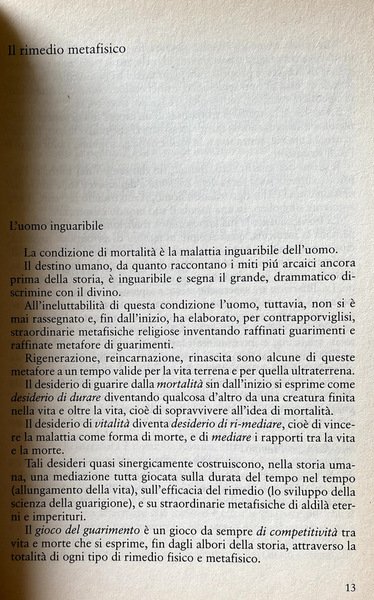 La nostra società sollecita la scienza a produrre nuovi rimedi per curare meglio e guarire di più, ma chiede anche alla medicina di misurarsi con l'anima antropologica di questa domanda attraverso una nuova cultura della cura. In tale cultura dalla cura è importante il mezzo scientifico, ma lo sono anche tutte quelle risorse naturali e quei valori relativi ai contesti di vita, alle visioni del mondo, alle forme di comunicazione che entrano in gioco nel rapporto medico-malato. Non si tratta quindi di un problema di aggiornamento umanistico della medicina, ma di una questione assai più complessa e profonda di rinnovamento dei suoi approcci, dei suoi metodi, della sua base concettuale e conoscitiva.