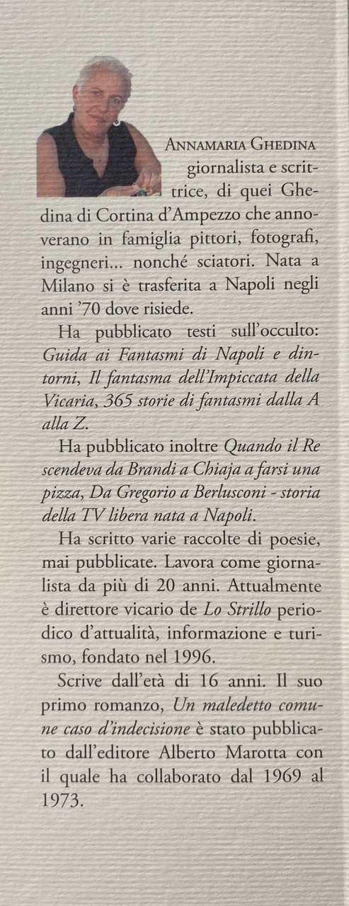 Soggetti: Mente Corpo Spirito Fenomeni paranormali, Racconti paranormali napoletani, Personaggi illustri, Mistero, Storia Cultura locale, Napoli, Esoterismo, Occultismo, Miti, Spiritualità, Lady ghost, Gialli, Brivido, Misteri napoletani, Principe di San Severo, Fantasmi, L'impiccata della Vicaria, Raimondo de Sangro, Don Salvatore, Domenico Mimì De Simone, Cronache, Storie vere, Mondo spiritico napoletano, Cappella gentilizia, Fil di ferro e plastica, Principe maledetto, Spiritismo, Aldilà, Comunicazione, Morti, Occultismo, Leggende napoletane, Terno secco, Cabala, Janara, Giuditta Guastamacchia, San Domenico Maggiore, Epigrafi, Scritti, Lettere, Macchine anatomiche, Scienziati, Intellettuali, Libri Vintage Fuori catalogo, Autobus M4, Cobaltina, Carmine Percuoco, Quadro misterioso, Asta, Sposa mancata, Gran Maestro, massoneria napoletana, Accademici della Crusca, Carlotta Caetani d'Aragona, Canto, Borboni, Regno, Settecento, Storia Esoterica, Biografie, Mind, Body, Spirit, Paranormal phenomena, Neapolitan paranormal tales, Famous people, Mystery, Local history and culture, Naples, Esotericism, Occultism, Myths, Spirituality, Thrillers, Thrills, Neapolitan Mysteries, Prince of San Severo, Ghosts, The hanged woman, Chronicles, True stories, Neapolitan spirit world, Gentile chapel, Wire and plastic wire, Cursed Prince, Spiritism, Afterlife, Communication, Dead, Occultism, Neapolitan legends, Dry Terno, Kabala, Epigraphs, Writings, Letters, Anatomical machines, Scientists, Intellectuals, Out of print books, Buses, Mysterious picture, Auction, Missed bride, Grand Master, Neapolitan Freemasonry, Academics of the Bran, Singing, Bourbons, Kingdom, Eighteenth century, Esoteric history, Biographies Janare Superstizione Superstition Collezionismo Napoletanità Fortuna Destino