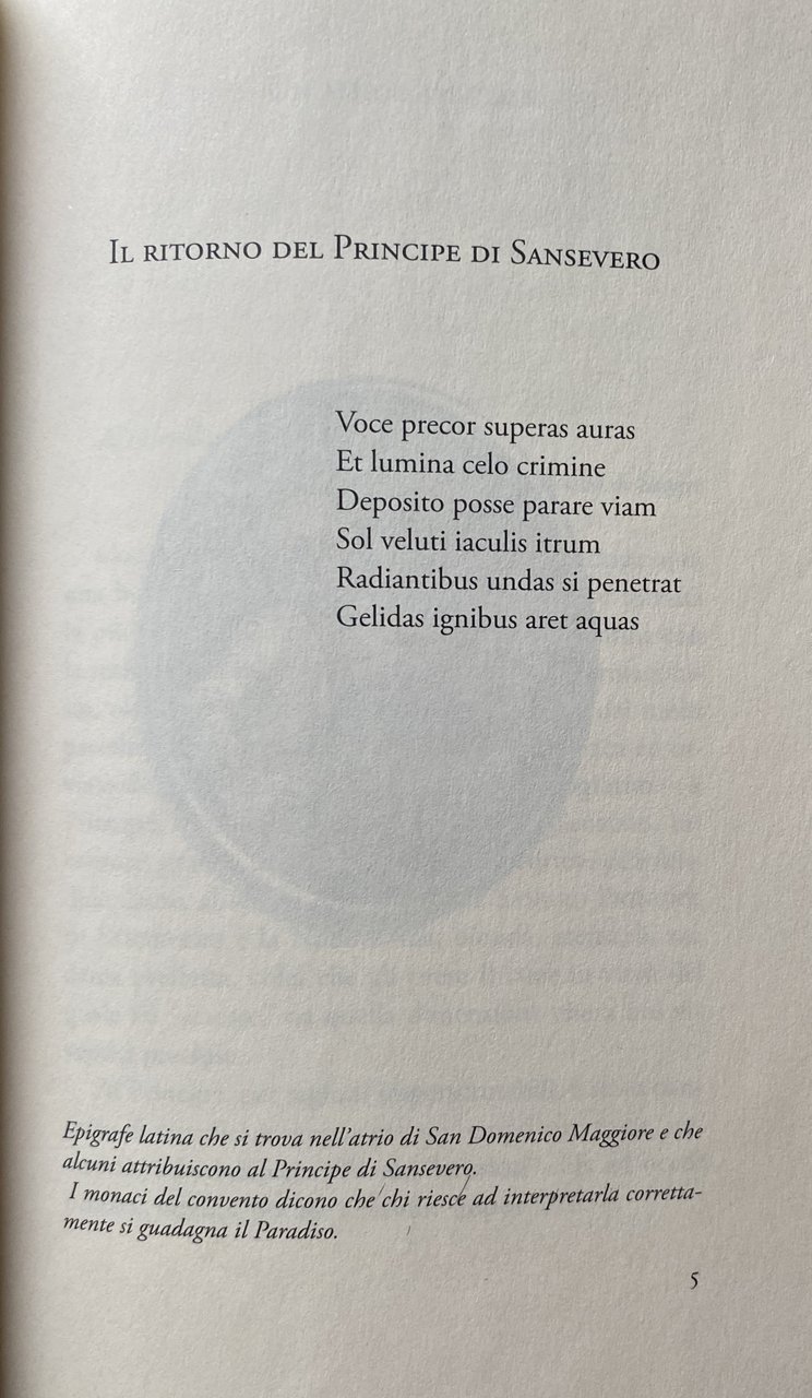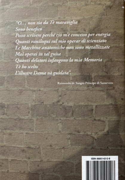 "O... non sia da Tè maraviglia Sono benefico Posso scrivere perché ciò m'è concesso per energia Quanti vaniloqui sul mio operar di scienziato Le Macchine anatomiche non sono metallizzate Mai operai in tal guisa Quanti delatori infangano la mia Memoria Tè ho scelto L'illustre Dama và guidata". Raimondo de Sangro Principe di Sansevero.