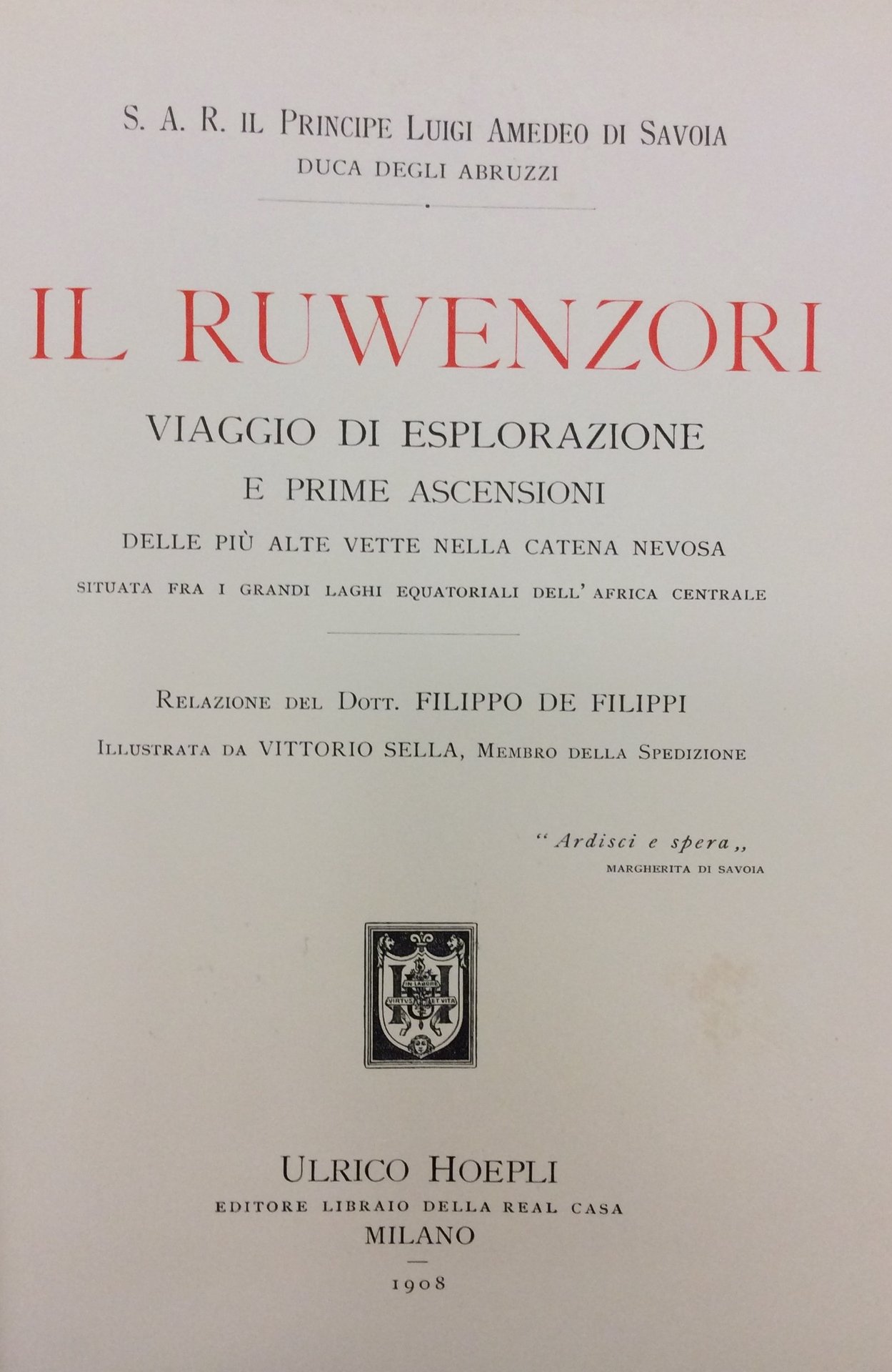 In-8 gr., tela editoriale azzurra, pp. XII,358, con 168 illustrazioni in bianco e nero nel testo, 1 tavola a colori applic. su cartoncino, 24 tavole in eliotipia fuori testo, oltre a 5 panorami piu' volte ripieg. e 6 carte geografiche a colori (ripieg.), Come da Indice. Resoconto della campagna esplorativa alla catena del Ruwenzori, diretta dal Principe Luigi Amedeo di Savoia, Duca degli Abruzzi, dall'aprile al settembre 1906. "Prima edizione". Esemplare ben conservato..