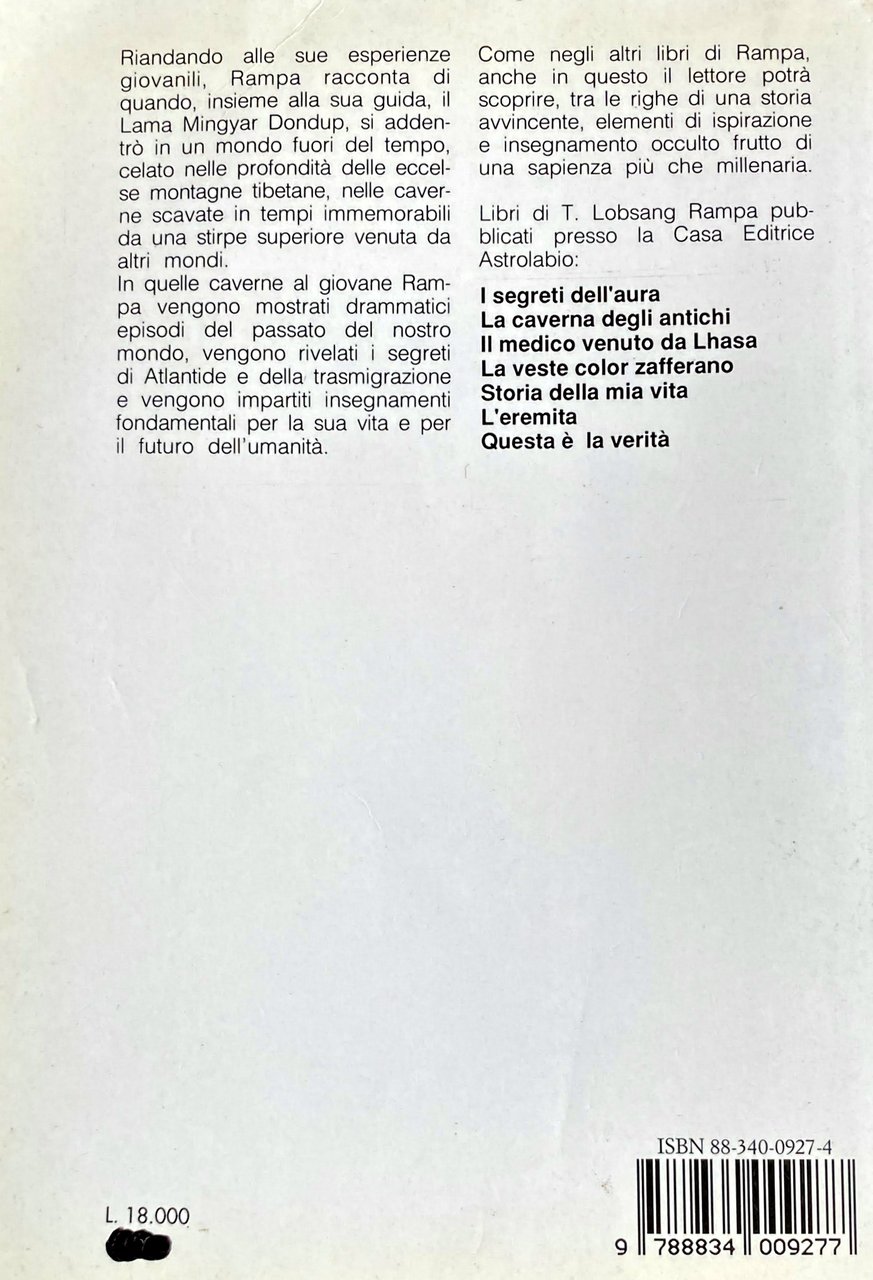 Riandando alle sue esperienze giovanili, Rampa racconta di quando, insieme alla sua guida, il Lama Mingyar Dondup, si addentrò in un mondo fuori del tempo, celato nelle profondità delle eccelse montagne tibetane, nelle caverne scavate in tempi immemorabili da una stirpe superiore venuta da altri mondi. In quelle caverne al giovane Rampa vengono mostrati drammatici episodi del passato del nostro mondo, vengono rivelati i segreti di Atlantide e della trasmigrazione e vengono impartiti insegnamenti fondamentali per la sua vita e per il futuro dell'umanità. Come negli altri libri di Rampa, anche in questo il lettore potrà scoprire, tra le righe di una storia avvincente, elementi di ispirazione e insegnamento occulto frutto di una sapienza più che millenaria.