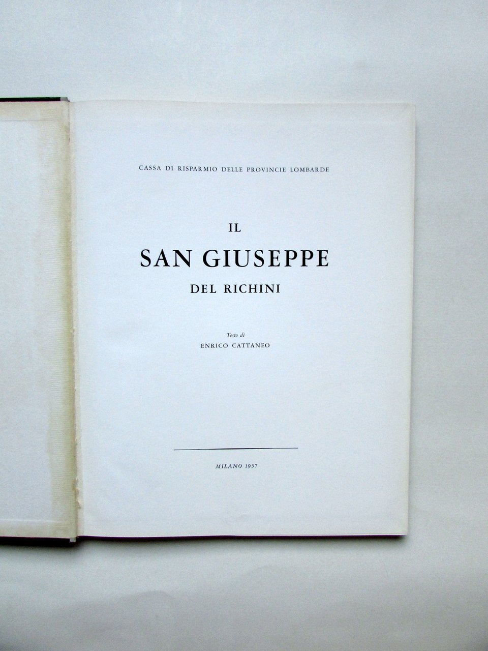Cassa di Risparmio delle Provincie Lombarde - il San Giuseppe del Richini testo di Enrico Cattaneo Milano, 1957; cm 28,5x22,5; pp. 96 con numerose ill.; mezza tela ed. con piatto ant. ill. a colori. Condizioni di conservazione Molto ben conservato con minime tracce d'uso, piatto post. con alcuni minimi aloni. Interni pressoché ottimi. SETT188.L26038 N