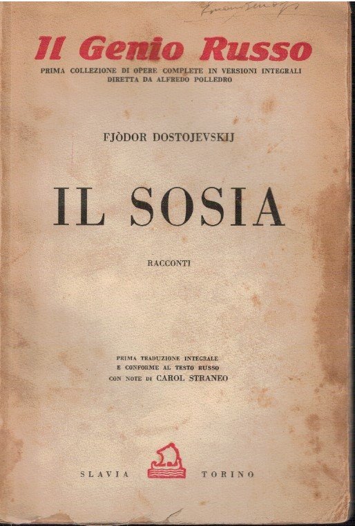 Brossura illustrata con macchie e tracce d'uso, dorso con segni di lettura, interno con fogli ingialliti ai bordi ma ben conservati, due firme di appartenenza una sul piatto e una alla pagina del frontespizio. due taglietti al foglio del titolo che non ledono il testo, buona copia in seconda edizione della Slavia di Torino. Prima traduzione integrale e conforme al testo russo con note di Carol Straneo. Non comune