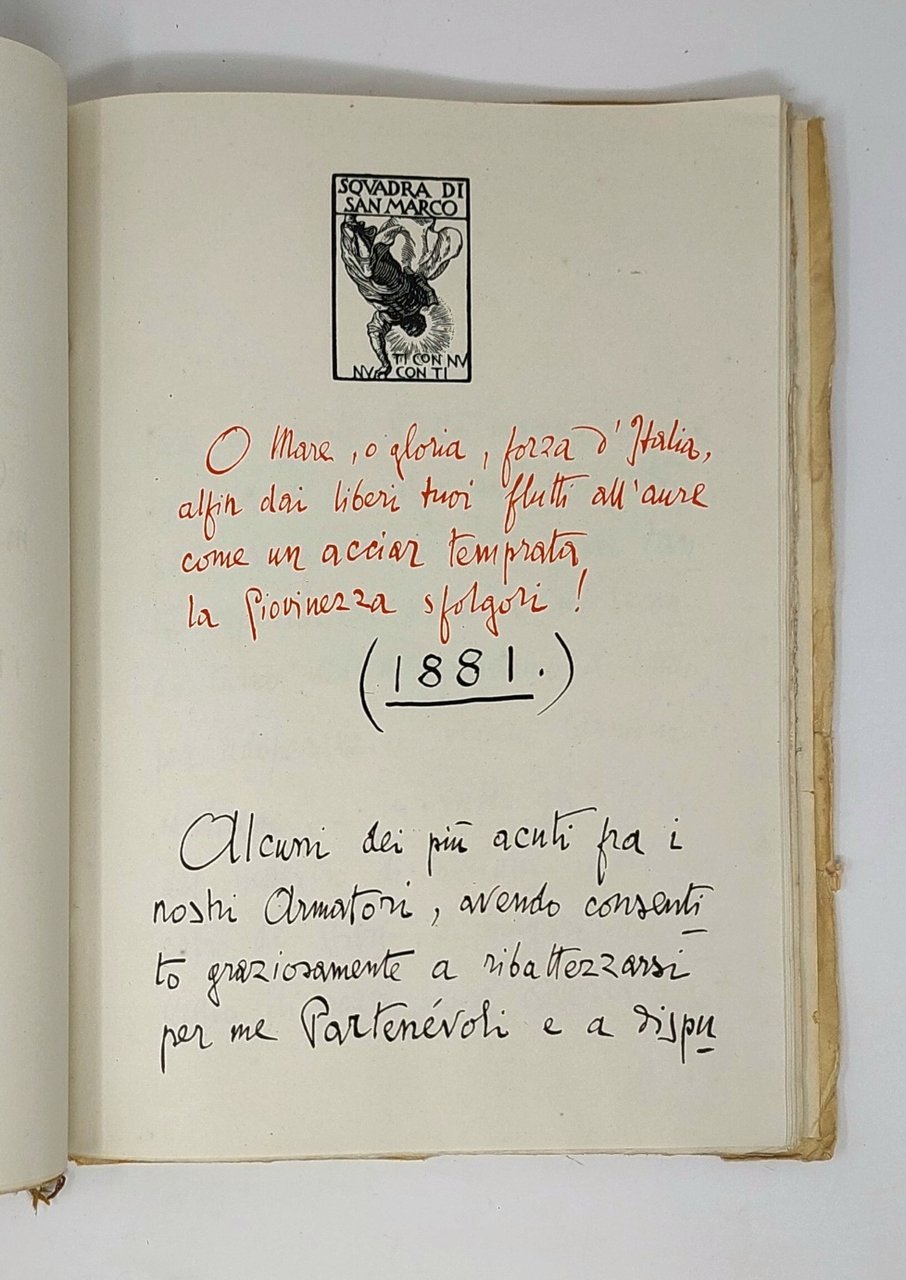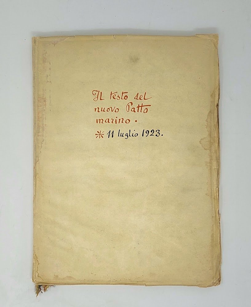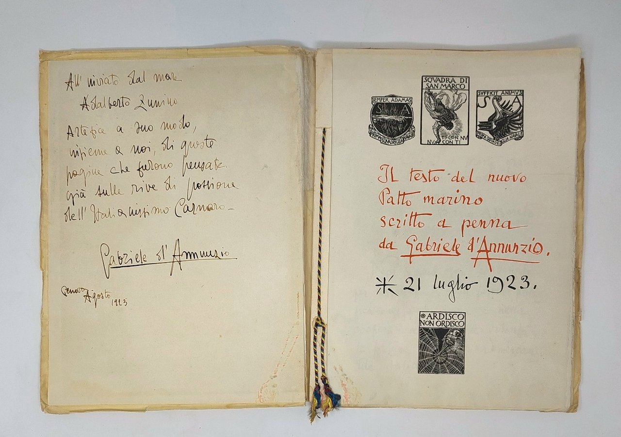 >in-folio, leg. edit. cart. tipo finta pergamena, con cordoncino giallo-rosso-azzurro a fermare i fogli. Edizione fuori commercio, stampata a cura della Federazione Marinara e unica che riproduce i due manoscritti dannunziani (cfr. Vecchioni). Frontespizio con quattro imprese dannunziane e titolo in facsimile d'autografo in rosso e nero: «Il testo del nuovo Patto marino scritto a penna da Gabriele d'Annunzio. 21 luglio 1923». I 22 fogli, impressi in rosso e nero solo al recto, con l'impresa in alto “Semper Adamas. Prima squadriglia navale. Il Comandante”, contengono in facsimile di scrittura il Preambolo (“Noi siamo oggi convenuti..”; ff. 1-10), il Patto (“Ed ecco le condizioni essenziali dell'accordo...”; ff. 11-22); seguono i 2 ff. nn. con “La sentenza quadrata da Gabriele d'Annunzio composta...” che termina con la data “9 decembre 1922”. Segue il «Commiato al Patto marino e Licenza ai fedeli interpreti», dat. in fine “Il Vittoriale: 11 febbraio 1924” (ff. 1 nn. e 27 num.), sempre in facsimile d'autografo ed impressi solo al recto, con l'impresa “Squadra di San Marco. Ti con nu. Nu con ti”. Esemplare con una curiosa dedica firmata Gabriele D'Annunzio alla sguardia anteriore, in nero, che rappresenta un interessante enigma: non è stata vergata da Gabriele D'Annunzio ed inoltre è datata "Genova, Agosto, 1923", ovvero l'anno precedente alla presente edizione. Inoltre non è stato possibile reperire notizie sul dedicatario, presumibilmente legato al Vate e all'impresa Fiumana, né sul misterioso ma ispirato imitatore non solo della grafia, ma anche dello stile di D'Annunzio, che ha composto la dedica: "All'inviato dal mare Adalberto Zunino, Artefice a suo modo, insieme a noi, di queste pagine che furono pensate già sulle rive di passione dell'Italianissimo Carnaro". Buon esemplare, internamente fresco, ma coperta un po' stanca e tracce d'umido in prossimità delle cerniere e al margine interno della sguardia e del frontespizio, dove il cordoncino ha rilasciato un po' di colore. Vecchioni n. 73a. Papalia p.22 -Z. Manca a De Medici, Guabello e Falqui.