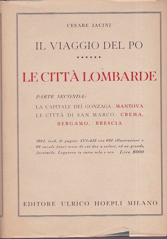 Il Viaggio del Po. Traccia storico - estetica per la visita ai monumenti ed ai luoghi della Valle Padana. Vol. VI. Le Città. Parte III. Lombardia. La Capitale dei Gonzaga: Mantova. Le Città di San Marco: Crema, Bergamo, Brescia | Libros antiguos y modernos | Jacini Cesare