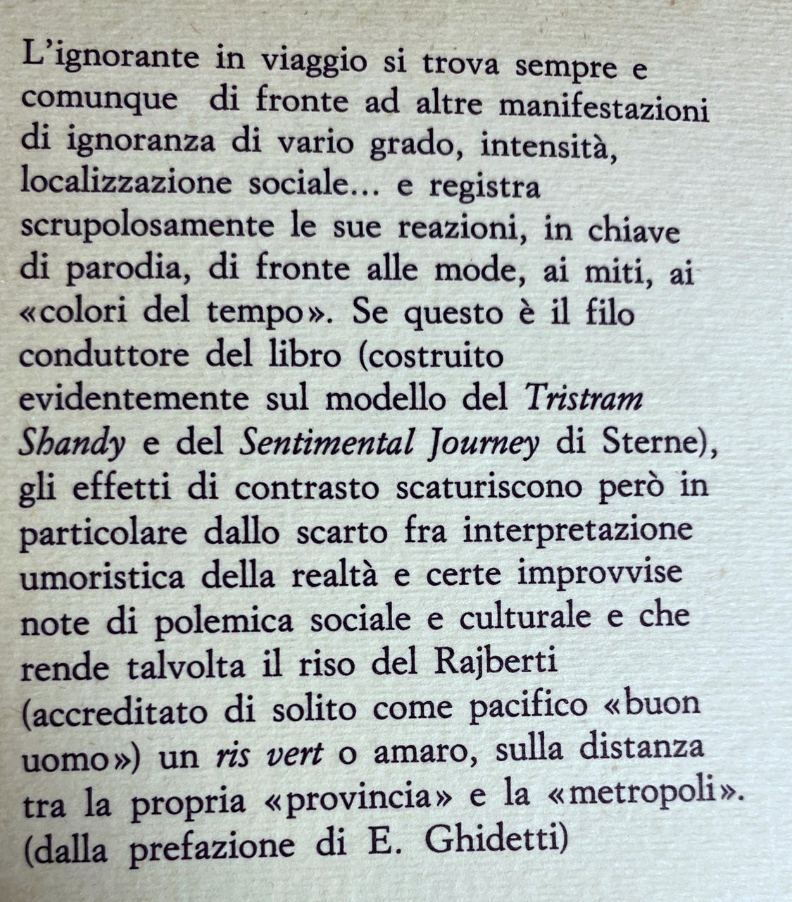 L'ignorante in viaggio si trova sempre e comunque di fronte ad altre manifestazioni di ignoranza di vario grado, intensità, localizzazione sociale e registra scrupolosamente le sue reazioni, in chiave di parodia, di fronte alle mode, ai miti, ai colori del tempo. Se questo è il filo conduttore del libro (costruito evidentemente sul modello del Tristram Shandy e del Sentimental Journey di Sterne), gli effetti di contrasto scaturiscono però in particolare dallo scarto fra interpretazione umoristica della realtà e certe improvvise note di polemica sociale e culturale e che rende talvolta il riso del Rajberti (accreditato di solito come pacifico buon uomo) un ris vert o amaro, sulla distanza tra la propria provincia e la metropoli.
