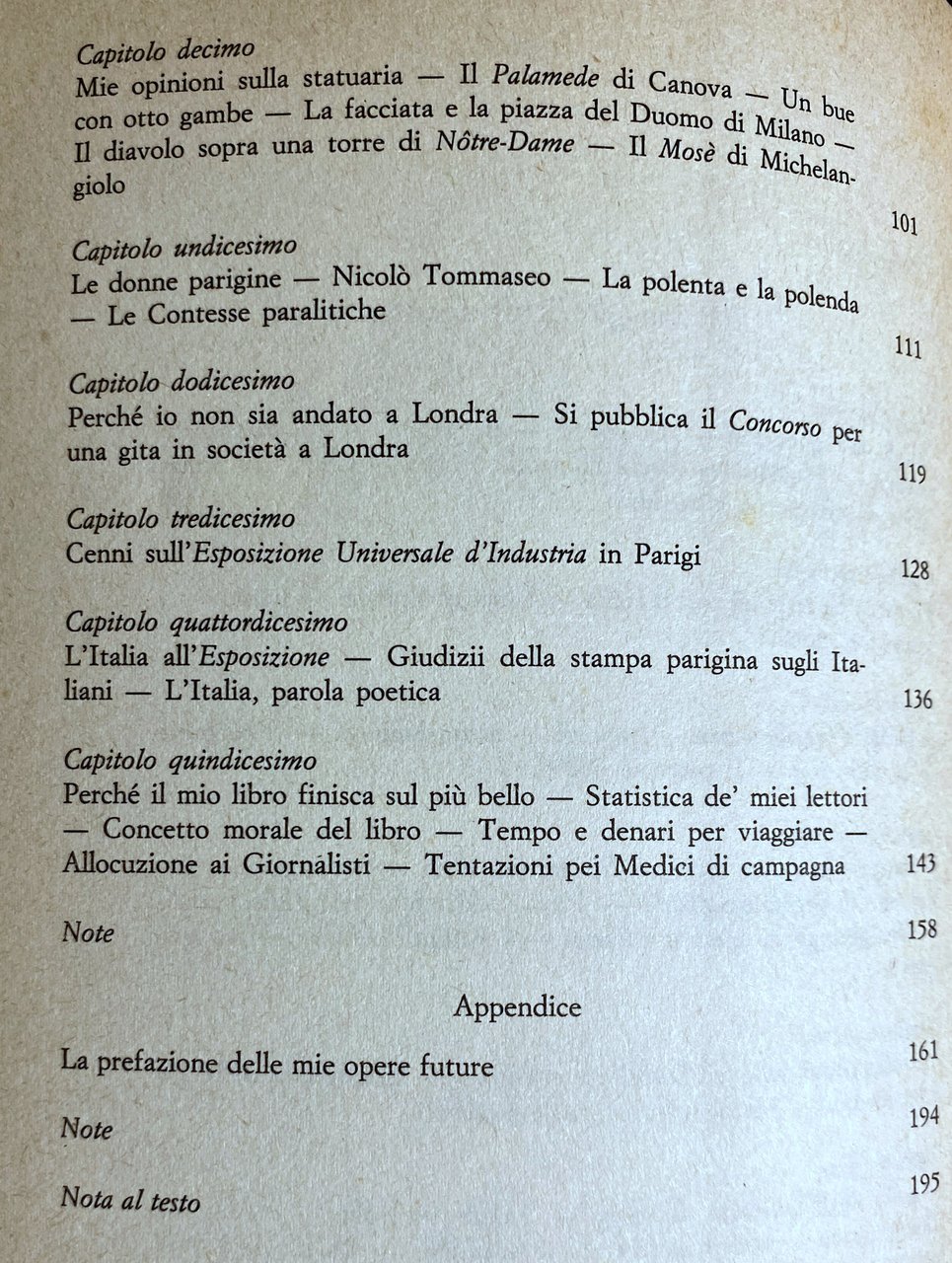 Soggetti: Letteratura di viaggio, Formazione spirituale, Collezionismo, Capolavori, Romanzi, Parodie, Ottocento, Novecento, Umorismo, Satira sociale, Medico poeta, Arte, Cultura accademica, Erudizione, Tipografia Bernardoni di Giovanni, Superbia, Acate Amici Belle arti Bois de Boulogne Brera Brougham Buon caffè Campi Elisi Contrade Esposizione Universale Parigi Filosofia Hotel Ignoranti Jardin des plantes Accidia Italia Laocoonte Lingua francese Londra Louvre Meraviglie Medici Milano Monza Mosè Ninive Paese Palamede Paolo Veronese Parigini Platone Porta Comasina Raffaello Sette peccati capitali Sorbetto Statua Strada ferrata Sublime Poveri Ricchi Convitare Amicizia Tolleranza Antologia Meneghina Brindisi Brofferio Cantù Carlo Cattaneo Carlo Porta Dialetto milanese Fagioli Giuditta Pasta Ignorante Italiani Poetica Manzoni Municipale Omeopatici Opuscoli Pasqualino Patriottismo Poesia Meneghino Pompeo Marchesi Porta Pill Quinto Orazio Flacco Rasori Ridere Rossini Scherzo Scherzoso Scritti Stile Tenca Tigellio Umoristico Uomo di Pietra Vivacità Libri rari fuori catalogo Metropoli europee Capitali Visitare Monumenti Strade Urbanistica Arrondissement Quartieri Filarete Chasles Pronuncia Antipatia Carattere Biblioteche Bestemmie Omnibus étoile Brera Boulevards Illuminazione Arco di Trionfo Ozio Vendemmia Pittura Impressionisti Monet Pinacoteca Louvre Leonardo da Vinci Gioconda Murillo Sergents de ville Attila Sposalizio della Madonna Correggio Giudizio Vaticano Cappella Sistina Michelangelo Buonarroti Paragoni Diavolo Notre Dame Duomo Canova Architettura Donne Niccolò Tommaseo Concorso Industria Londra Polenta Usi e costumi Cibo Alimentazione Piatti tipici Gastronomia Gita Itinerario Consigli Soldi prezzi Lire Franchi Denari Giornalisti Recensioni Prese in giro Giudizi Morale Società borghesia Aristocrazia Nobiltà Povertà Miseria Differenze Classi sociali Prefazione Divertimento Tempo libero Miti Buon gusto Alba Pigatto Carlo Dossi Giuseppe Rovani Clara Maffei Gatti Gatto Voyage Scapigliatura Opere future Travel literature Spiritual education Collecting Masterpieces Novels Parodies 19th century Humor Social satire Doctor poet Art Academic culture Erudition Pride Friends Fine arts Good coffee Champs Elysees Contrade Universal Exhibition Paris Philosophy Ignorant Sloth Italy Laocoon French language London Wonders Doctors Milan Monza Moses Nineveh Town Parisians Plato Raphael Seven Deadly Sins Sorbet Statue Railway Track Poor Rich Convite Friendship Tolerance Anthology Milanese Dialect Ignorant Italians Poetics Homeopathic Pamphlets Patriotism Poetry Horace Laughing Joke Jocular Writings Humorous Style Man of Stone Vivacity Rare books out of print European metropolises Capitals Visiting Monuments Streets Urbanism Neighborhoods Pronunciation Antipathy Character Libraries Blasphemies Lighting Arc de Triomphe Leisure Harvest Painting Impressionists Gallery Mona Lisa Marriage Madonna Judgment Vatican Sistine Chapel Comparisons Devil Architecture Women Competition Industry London Traditions and customs Food Nutrition Typical dishes Gastronomy Excursion Itinerary Advice Money prices Lire Francs Journalists Reviews Teases Judgments Morality Society bourgeoisie Aristocracy Nobility Poverty Misery Differences Social classes Preface Entertainment Free time Myths Good taste Future works