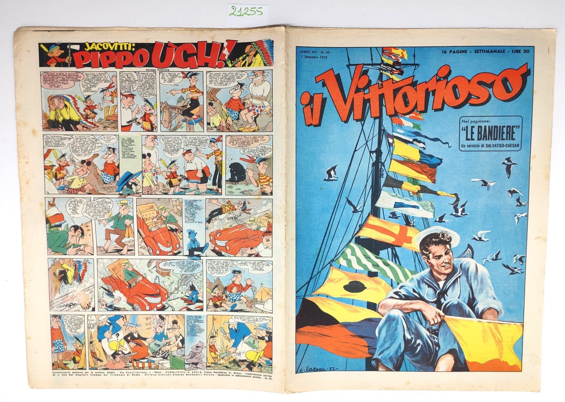 in condizioni accettabili, piccoli strappi alla costola e ai margini dei piatti, una piega trasversale su tutta la rivista, interno in discrete condizioni, margine esterno leggermente brunito, piccoli strappi e ai margini segni di usura, numero pagine 16 dimensione 36 x 26,5