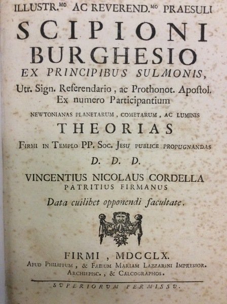 ILLUSTR.MO AC REVEREND.MO PRAESULI SCIPIONI BURGHESIO EX PRINCIBUS SULMONIS, ... NEWTONIANAS PLANETARUM, COMETARUM, AC LUMINIS THEORIAS FIRMI IN TEMPLO PP. SOC. JESU PUBLICE ...