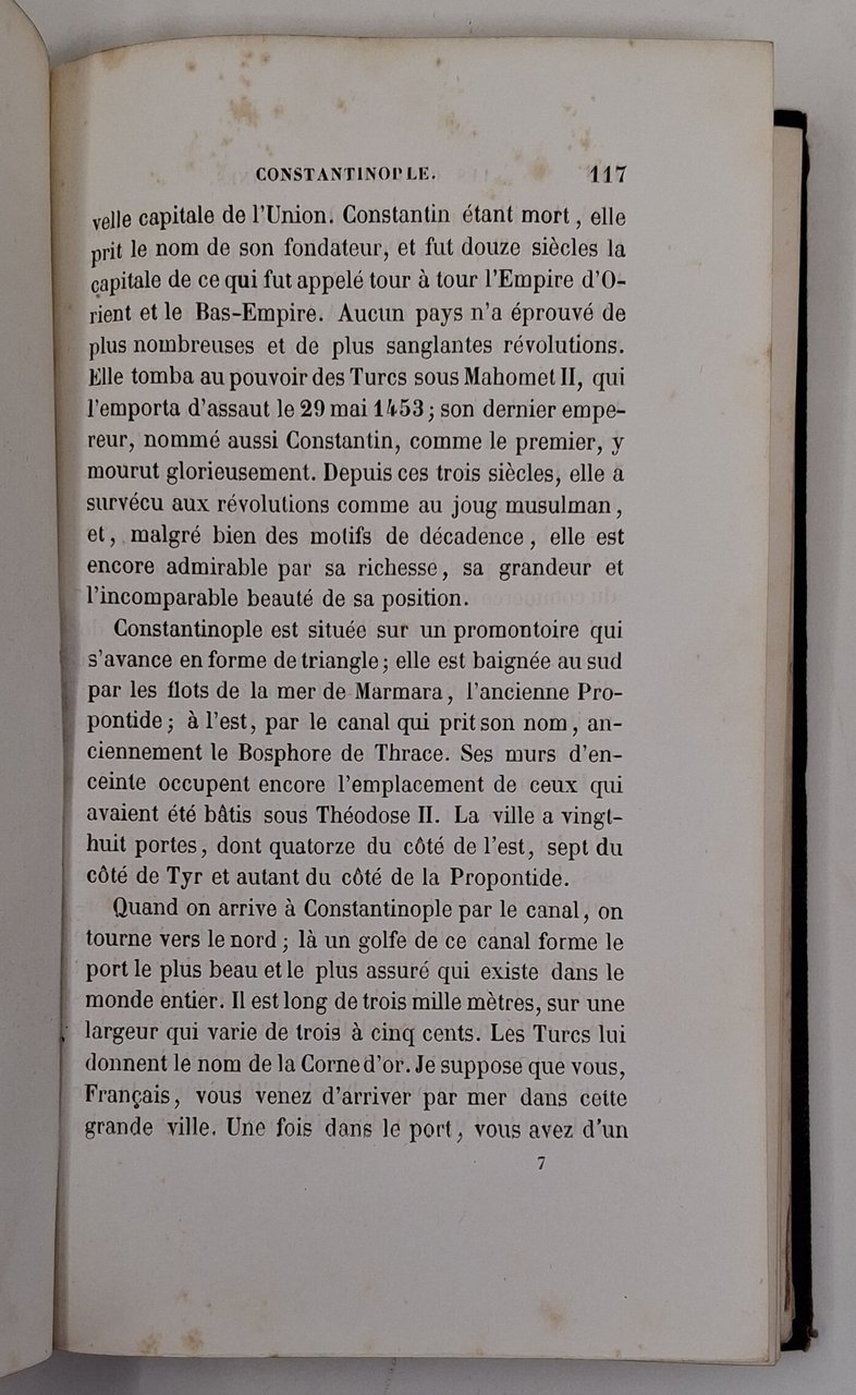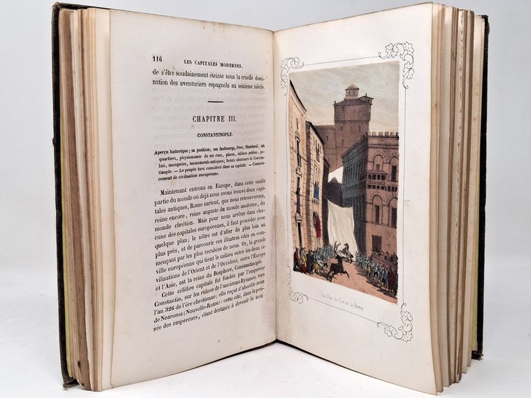 >in-16, pp. 288, legatura editoriale in tela decorata a colori, in oro e asecco (difetti al dorso), tagli dorati. Sguardo d'insieme storico-archeologico ed artistico sulle città capitali antiche (Babilonia, Ninive, Tebe, Gerusalemme, Atene, Roma, ecc.), moderne (Pechino, Calcutta, Damasco), alcune città dell'America (New-York, Mexico, Lima) e d'Europa (Vienna, Londra, Parigi, Roma moderna). Il volumetto è corredato di 8 graziose tavole f.t. in litografia a colori (vedute di Londra, Gerusalemme, Pechino, Roma, San Pietroburgo, Berlino, Costantinopoli e Parigi). Buon esempl., con ex-libris del conte napoletano Giov. Janigro-Positani, macchiolina di inchiostro al margine inferiore.
