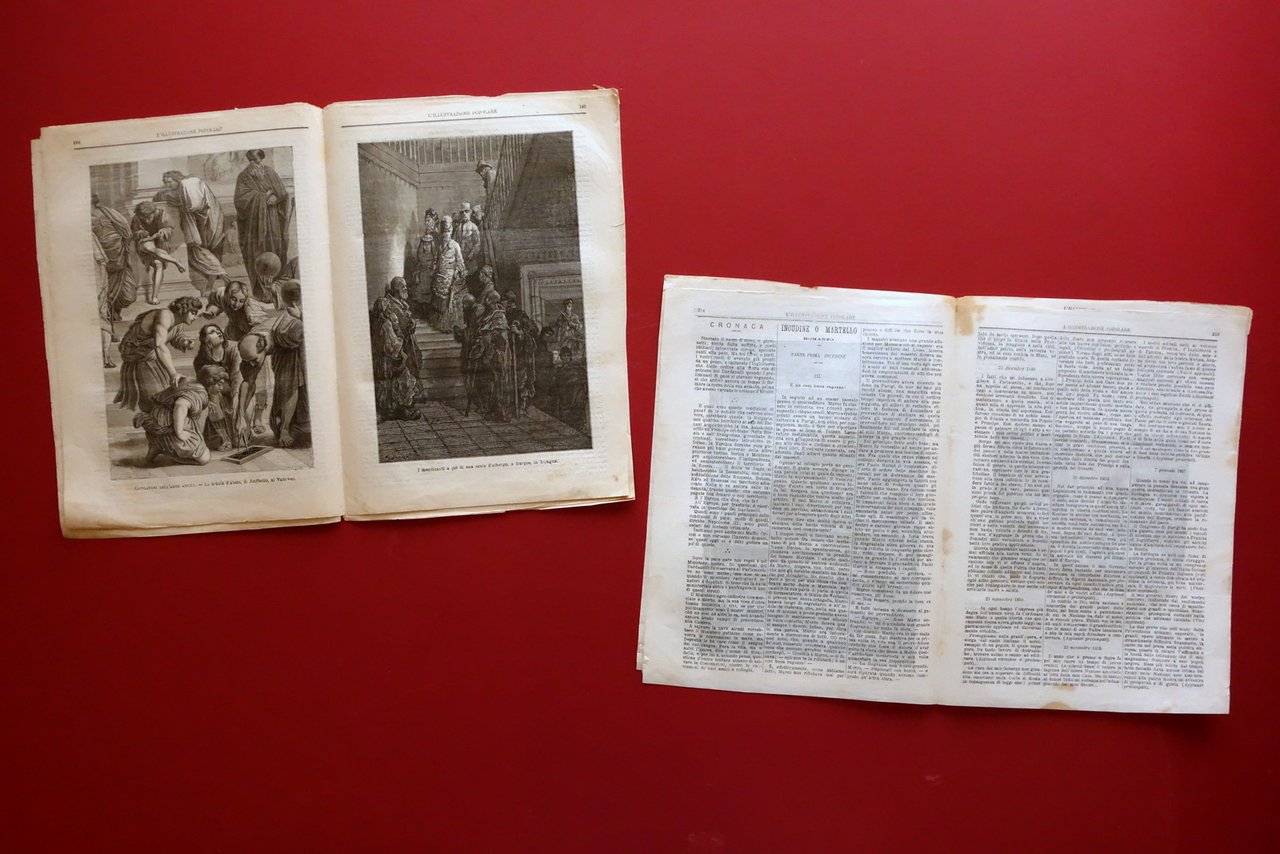 2 numeri di rivista, L'Illustrazione Popolare" vol. XV - numeri 12 e 14 Milano, 20 gennaio e 3 febbraio 1878 copertine e alcune pagine dedicate alla scomparsa del Re Vittorio Emanuele II 2 numeri Treves, Milano 1878; cm 30,5x22; da pagina 177 a pagina 192 (numero 12); da pagina 209 a pagina 224 (numero 14); entrambi con ill. in b/n nel t. e fuori t.; esemplari autonomi con numerazione progressiva, a fogli sciolti. Numero 12 completo. Numero 14 mancante delle pagine 215-218. Condizioni di conservazione Entrambi in buone condizioni con tracce d'uso, alcune leggere bruniture e lievi accenni di ingiallimento dovuti all'età e alla carta utilizzata per la stampa, dorsi e qualche pagina con piccoli / minimi marginali strappetti; numero 14 mancante delle pp. 215-218. Margini di entrambi i numeri leggermente rifilati. 2 numeri, le cui copertine e prime pagine sono dedicate alla scomparsa del Re Vittorio Emanuele II. Il numero 12 è completo; il numero 14 è mancante delle pagine 215-218. SC03.D19623 N "