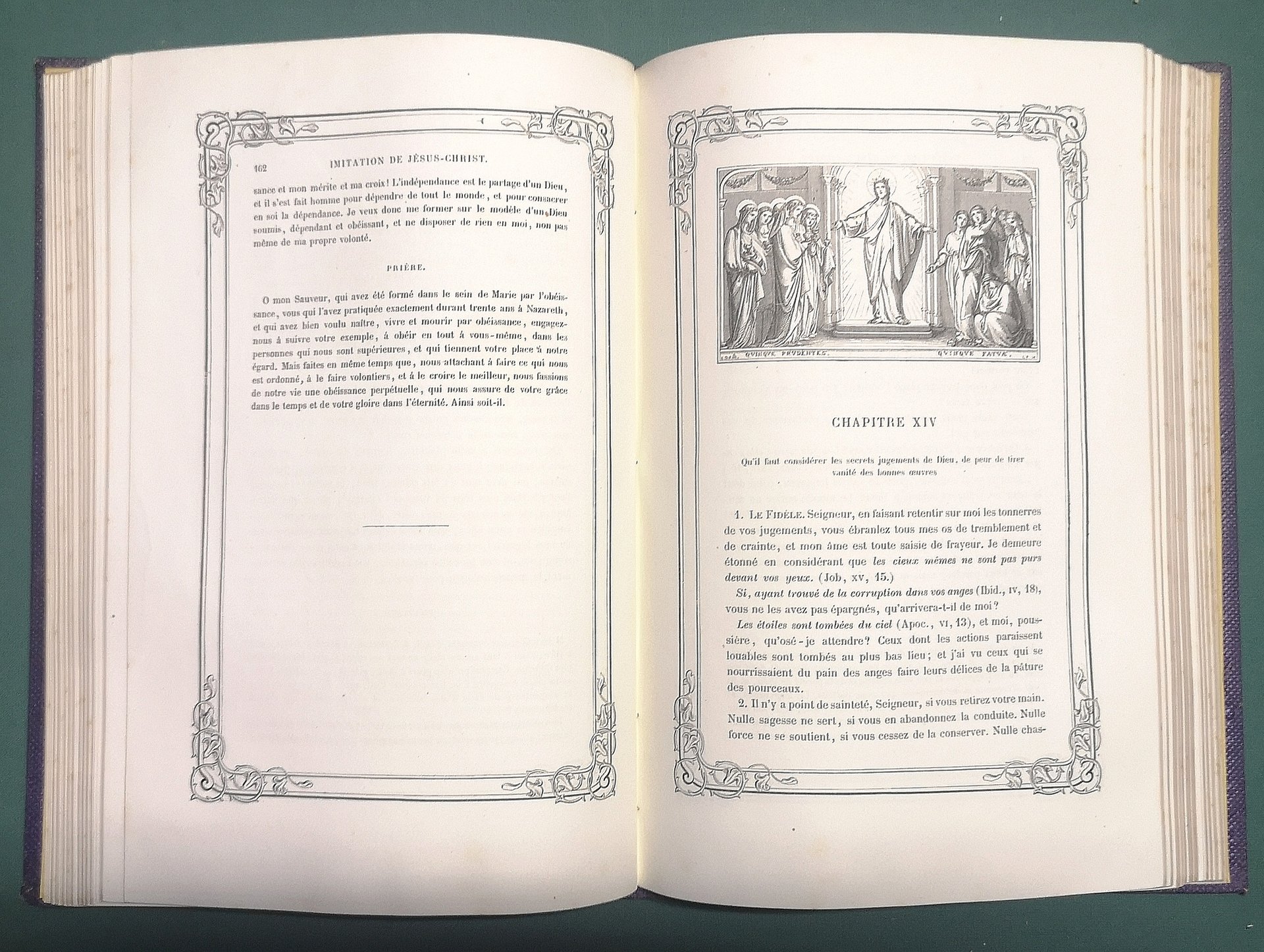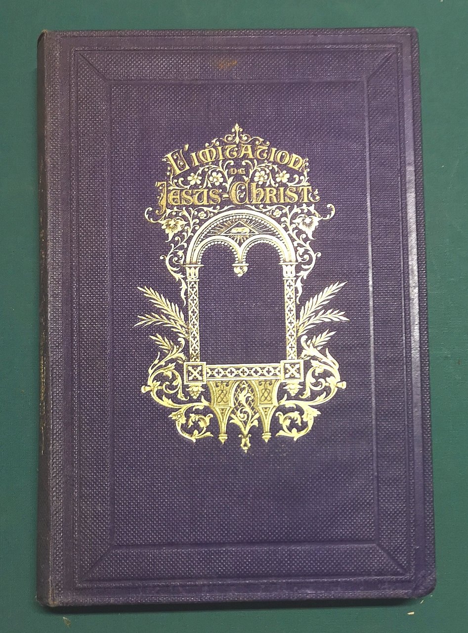 >in-4, pp. 392 tutte ornate da graziosa cornice di gusto romantico e ornate da centinaia di vignette n.t, antiporta figurato. Legatura coeva in p. percallina viola ornata da cornici a secco ai piatti, titolo e ricco fregio in oro al piatto anteriore e al dorso, tagli dorati. Edizione tradotta dal gesuita Gonnelieu, illustrata da Hallez e arricchita da una preghiera in fine di ciascun capitolo. Perfetto esemplare, lievissime e sporadiche arrossature.