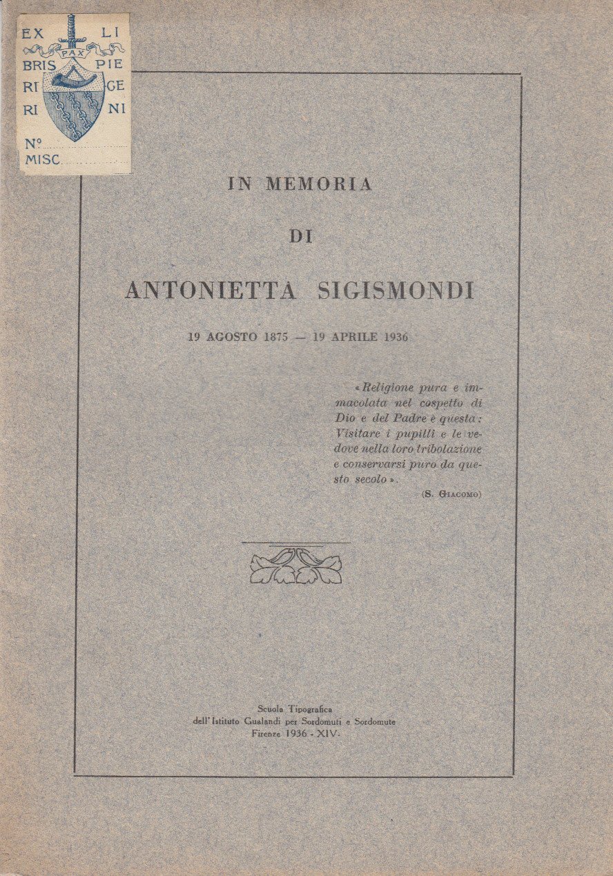 In-8 (Cm 21,5 x 15,2), pp. 8, brossura editoriale, fotografia della Sigismondi alla prima pagina. MOLTO BUONO - Nacque a Nervesa in provincia di Trevis il 19 Agosto 1875 dal dottore Sigismondo Sigismondi e dalla contessa Giulia Panigai. Nel 1886 ando' con la famiglia a Firenze e frequento' l'Istituto privato delle signorine Pettini conseguendo il diploma di Maestra alla scuola magistale di S. Trinita'.Trasferitasi prima a Bergamo e poi a Roma torno' a Firenze nel 1908 in casa della signorina Emilia Pettini. Nel 1925, alla morte della Pettini, si stabili' presso le Figlie della carita' in Via del Campuccio. Fu zelante nella visita ai poveri, agli ospedali, alle carceri ai monasteri bisognosi. Apparteneva alle Dame e Damine della carita', alla conferenza interparrocchiale di Santa Trinita, e al consiglio del Pio Istituto degli Angeli Custodi di Varlungo.