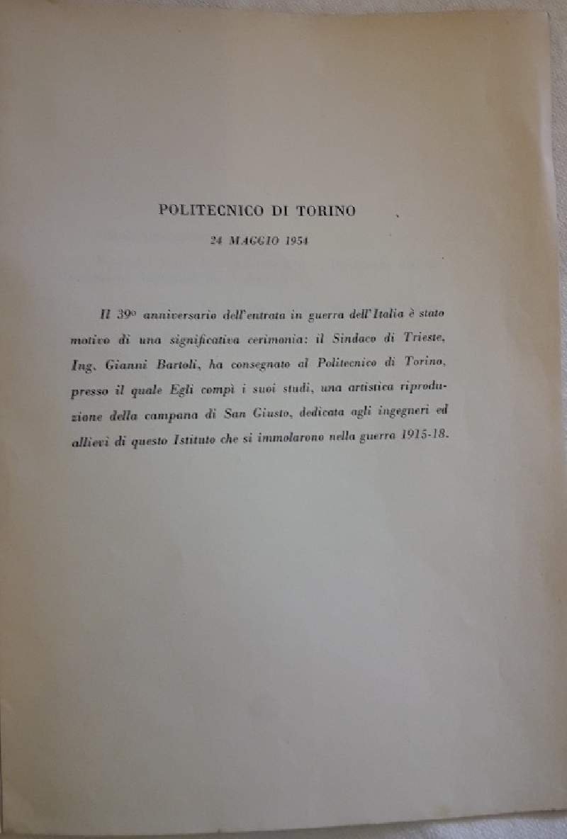 IN OCASIONE DELLA CERIMONIA PER LA CONSEGNA DELLA RIPRODUZIONE DELLA CAMPANA DI SAN GIUSTO(1954)