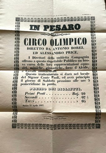 In Pesaro - Circo Olimpico diretto da Antonio Borel ed Alessandro Price. I Direttori della suddetta Compagnia offrono a questo rispettabile Pubblico un breve corso delle loro rappresentazioni equestri, mimiche, ginnastiche, forze d’Alcide e Cavalli ammaestrati...