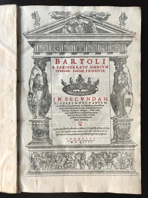 In-folio (cm. 42,8), legatura coeva in piena pergamena rigida con titolo anticamente ms. su cartiglio al dorso (strappi al dorso); cc. 263 in ottimo stato, titolo in rosso e nero inquadrato in cornice architettonica; testo gotico su due colonne; lievissime e sporadiche fioriture. testo in gotico su due colonne, frontespizio in rosso e nero inquadrato in splendida cornice, numerosi capilettera in silografia. Pregevole edizione veneziana di una parte del commentario bartoliano del Digesto nuovo, stampata per i torchi della compagnia dei libri della Corona (Tommaso e Giovanni Maria Giunta, Girolamo e Ottaviano Scoto il giovane, Gabriele Giolito de Ferrari e Federico Torresano). Questa società si serviva dei tipografi Comin da Trino, Aurelio Pinzi e altri. Esemplare molto buono e genuino. (SC3)
