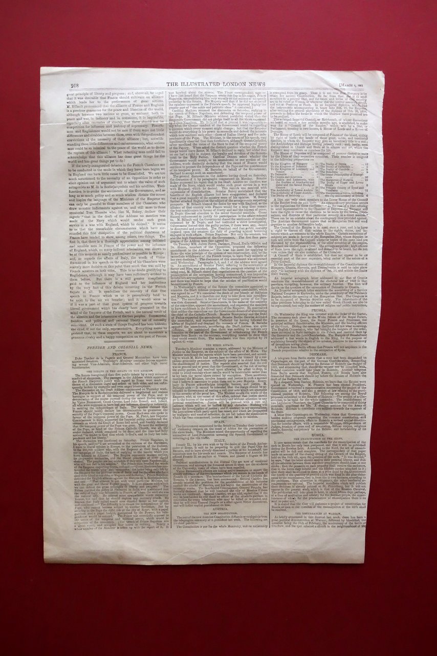 Illustrazione incisa alla prima pagina di giornale, A barber's shop at Richmond, Virginia, by Eyre Crowe [.]" bella illustrazione incisa in bianco e nero su metà della prima pagina della rivista "The Illustrated London News" 9 marzo 1861 Londra, 1861; bella illustrazione incisa in b/n su metà della prima pagina di giornale. Numero non completo (solamente la prima pagina). Cm 40,5x27,5. Condizioni di conservazione Buone condizioni con minimi segni del tempo, margini leggermente rifilati, leggera traccia di pieghetta all'angolo superiore sinistro. Numero non completo (solo la prima pagina). SC03.D19357 N F "
