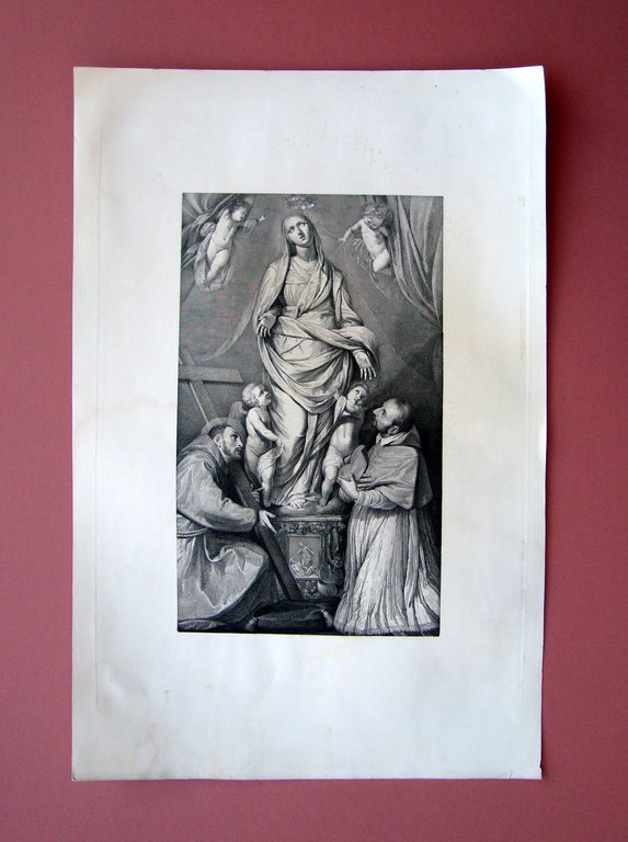 Incisione rame met‡ '800 S.Francesco S.Borromeo adorazione statua della Vergine
