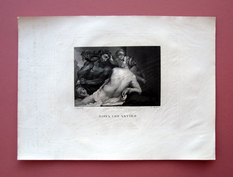 Incisione su rame d'epoca 1842 , NINFA CON SATIRO Da un dipinto di Caracci tratto da Galleria Pitti illustrata per cura di Luigi Bardi Firenze coi Tipi della Galileana 1842 Incisione a bulino (su rame), Tipi della Galileiana Firenze 1842, cm 31,5x43,5 misura del foglio Condizioni di conservazione. Buono stato di conservazione, leggere tracce di sporco e ondulazioni. Incisione d'epoca originale (1842) INC.0114 blu