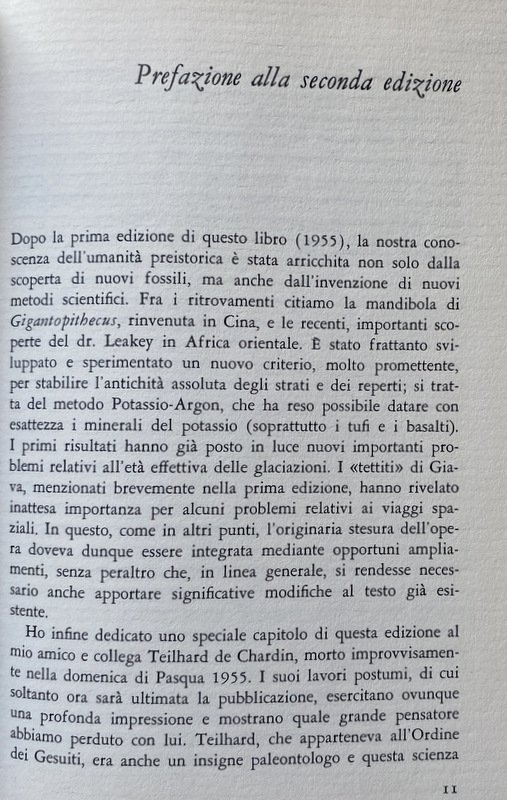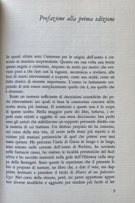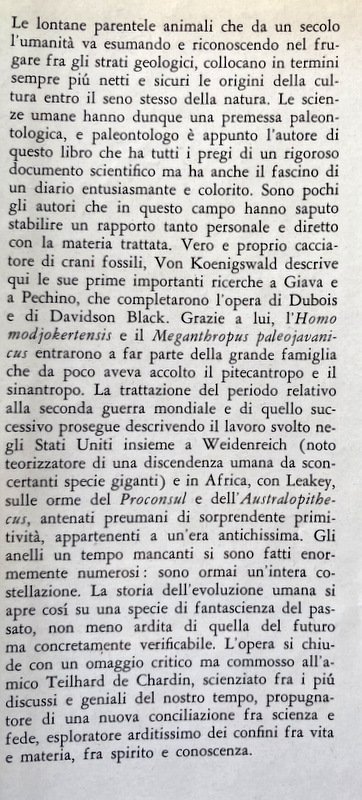 Le lontane parentele animali che da un secolo l'umanità va esumando e riconoscendo nel frugare fra gli strati geologici, collocano in termini sempre più netti e sicuri le origini della cultura entro il seno stesso della natura. Le scienze umane hanno dunque una premessa paleontologica, e paleontologo è appunto l'autore di questo libro che ha tutti i pregi di un rigoroso documento scientifico ma ha anche il fascino di un diario entusiasmante e colorito. Sono pochi gli autori che in questo campo hanno saputo stabilire un rapporto tanto personale e diretto con la materia trattata.