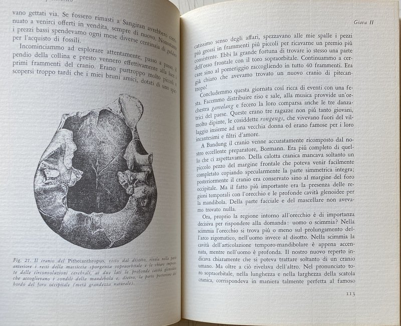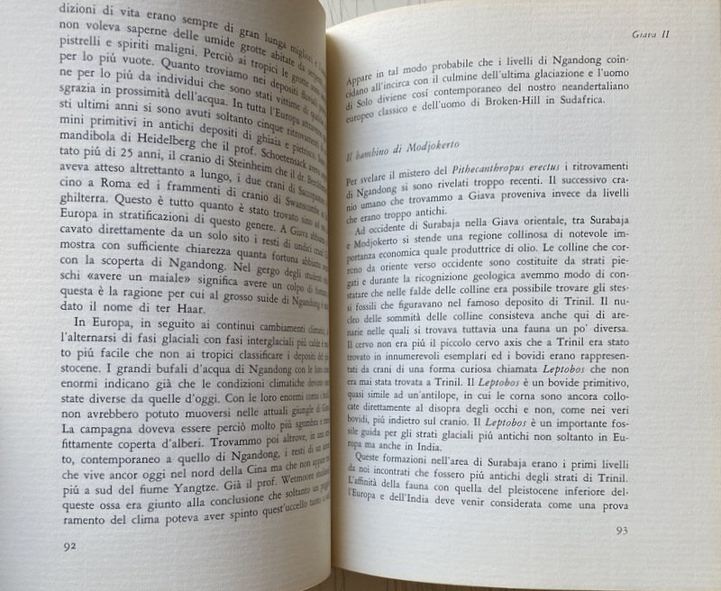 Soggetti: Archeologia, Etnologia, Preistoria, Paleontologia, Geologia, Storia antica, Antropologia culturale, Studi culturali, Antiche civiltà, Uomo preistorico, Reperti, Scavi archeologici, Scoperte, Viaggio, Esperienze, Testimonianze, Biografie, Fossili, Caccia, Animali, Religione, Mitologia, Miti, Riti, Rituali, Comunità, Tribù, Uomini primitivi, Geroglifici, Evoluzione, Eugene Dubois, Cacciatori di teste, Teschio, Cranio, Gigantopithecus, Thomas Henry Huxley, Heidelberg, Bronzo, Pietra, Ferro, Utensili, Armi, Haar, Filippine, Cina, Indonesia, America, Hawaii, Caverne, Grotte, Giurassico, Isole, Giava, Himalaya, Asia, Oceania, L.S.B. Leakey, Jung, Leida, Anatomia, Sir Arthur Keith, Penisola di Malacca, Madagascar, Africa, Formosa, Kilimangiaro, Maori, Storia naturale, Musei, Pechino, Isola di Pasqua, Neanderthal, Merapi, Ngandong, Caledonia, Nuova Guinea, Nuova Zelanda, Palestina, Israele, Pithecanthropus erectus, Pleistocene, Ere geologiche, Dinosauri, Catena alimentare, Punung, Fuoco, Acqua, Rhodesia, Rusinga, Solo, Pieter Vincent van Stein Callenfels, Serengeti, Scimmie, Elefanti, Scrittura, Murales, Disegni, Sanscrito, Linguaggio, Sumatra, Rudolf Virchow, Weidenreich, Arthur Smith Woodward, Australia, Bandung, Gunnar Andersson, Borneo, Davidson Black, Bali, Robert Broom, Charles Darwin, Celebes, Fauna, Bacche, Cibo, Djetis, Argilla, Tufo, Trinil, Denti, Diastema pitecoide, Ornamenti, Proconsul, Gorilla, Ritrovamenti, Frammenti, Vita quotidiana, Donne, Homo faber, Esplorazioni, Esploratori, Libri illustrati, Foto d'epoca, Collezionismo, Libri Vintage fuori catalogo, Bibliografia, Riferimento, Fonti, Mandibola, Gesuiti, Linneo, Piante, Sapiens, Georges Cuvier, Naturalisti, Naturalismo, Catastrofismo, Zähne, Schädel, Menschenaffen, Weidenreich, Ossa, Fisiologia, Gigantopithecus, Die Geschichte des Menschen, Tektites, Aurignacian, Australopithecus, Miocene, Molari, Scimpanzé, Mammiferi, Meeting Prehistoric Man, Sangiran, Histoire Naturelle, Archaeology, Ethnology, Prehistory, Paleontology, Geology, Ancient history, Cultural anthropology, Cultural studies, Ancient civilizations, Prehistoric man, Finds, Archaeological excavations, Discoveries, Travel, Experiences, Testimonials, Biographies, Fossils, Hunting, Animals, Religion, Mythology, Myths, Rites, Rituals, Community, Tribes, Primitive men, Hieroglyphics, Evolution, Headhunters, Skull, Bronze, Stone, Iron, Tools, Weapons, Philippines, China, Caves, Jurassic, Islands, Java, Leiden, Anatomy, Peninsula, Natural history, Museums, Beijing, Easter island, New Zealand, Palestine, Israel, Pleistocene, Geological eras, Dinosaurs, Food chain, Fire, Water, Monkeys, Elephants, Writing, Drawings, Sanskrit, Language, Berries, Food, Clay, Tuff, Trinil, Teeth, Pithecoid, Ornaments, Gorilla, Finds, Fragments, Daily life, Women, Explorations, Explorers, Illustrated books, Vintage photos, Collecting, Out-of-print books, Bibliography, Reference, Sources, Mandible, Jesuits, Linnaeus, Plants, Naturalists, Naturalism, Catastrophism, Bones, Physiology, Molars, Chimpanzees, Mammals