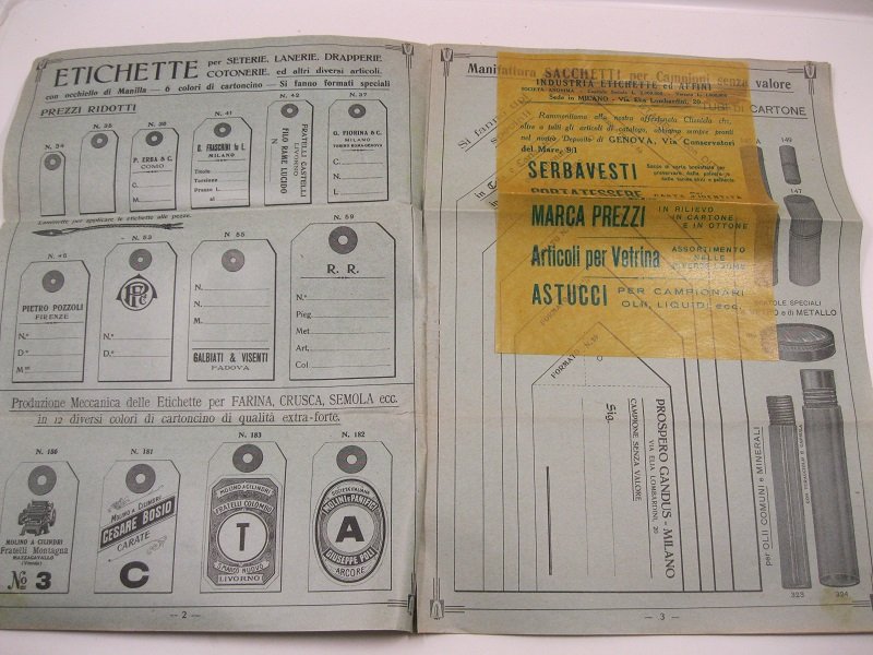 In 4, cm 33 x 24, pp. (8) interamente illustrate. Brossura compresa nella numerazione. Si accludono 2 circolari. Ditta produttrice di etichette per seterie, lanerie, drapperie, cotonerie ed altri diversi articoli: sacchetti di carta, sigilli in acciaio, etichette gommate ecc.