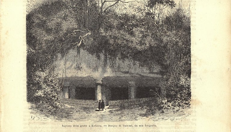 Ingresso delle grotte a Elefanta (Malabar). Stampa 1863.