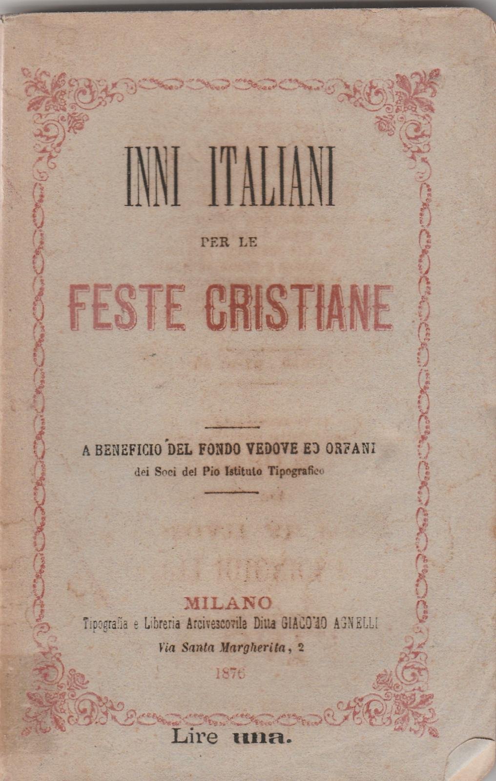 INNI ITALIANI PER LE FESTE CRISTIANE A BENEFICIO DEL FONDO VEDOVE E ORFANI MILANO 1876 6070 COPERTINA MORBIDA EDITORIALE CON ALONI E PICCOLE PIEGHE AI PIATTI TRACCIA DI ETICHETTA AL DORSO, PIEGHE AGLI ANGOLI DELLE PRIME PAGINE, ANTIPORTA NUMERO DI CATALOGAZIONE A PENNA BLU ALL'ANGOLO SUPERIORE, NUMEROSE FIORITURE E ALONI ALLE PAGINE INTERNE NUMERO PAGINE 140 DIMENSIONI CM 15 X 9,7