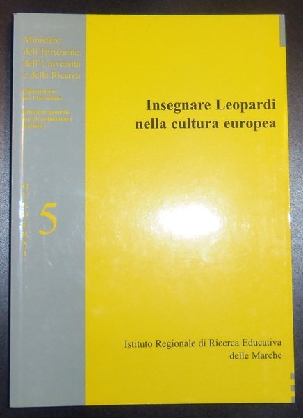 [Leopardi- Didattica](cm. 21) brossura editoaile a colori, -pp. 302. Il volume raccoglie contributi e riflessioni dai seminari per docenti di letteratura italiana, lingua Inglese, Francese, e Tedesca. Si suddivide in: 1) Leopradi e la cultura europea, 2) La scrittura della memoria, 3)Le forme della lirica: tradizione e innovazione, 4) Laboratori didattici, riflessioni ed esperienze. In fine esempio di progettazione interdisciplinare. Volume intonso, pari al nuovo. [n33]