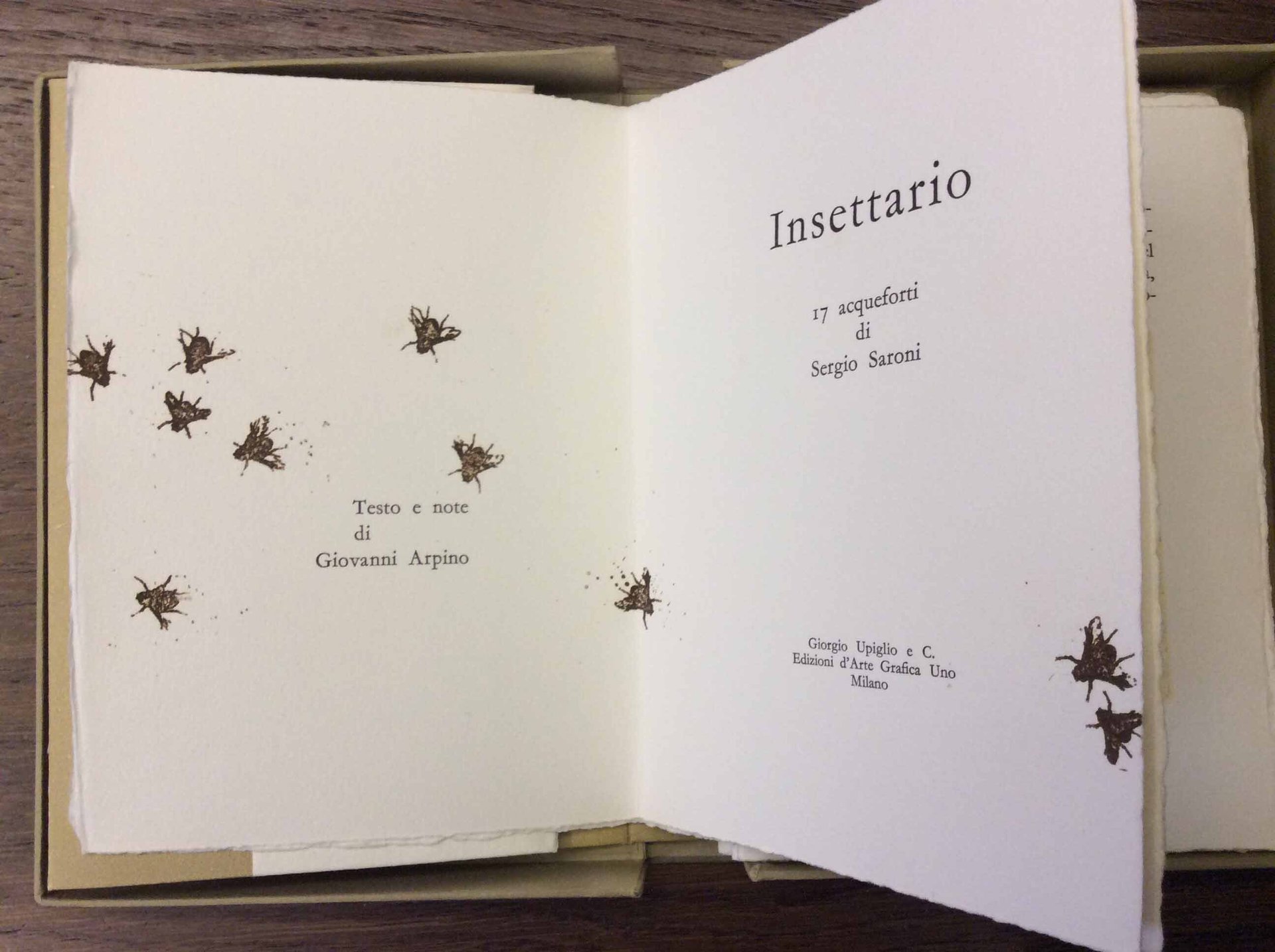 In-16 (mm. 175x125), copertina edit. in cartoncino figurato contenente, a fogli sciolti, pp. 37,(3); testo e note di Giovanni Arpino, molto ben illustrato da 17 acqueforti originali a colori del pittore torinese Sergio Saroni (1934-1991), tirate sui torchi di Giorgio Upiglio. E una riflessione sullo straordinario sistema di sopravvivenza degli insetti, la cui perfezione travalica la stessa immaginazione umana. Cfr. Jentsch,522.Edizione originale di 85 esemplari numerati, firmati dallartista e dallautore, stampati su carta a mano della Filicarta. Il ns., 62, è in ottimo stato.