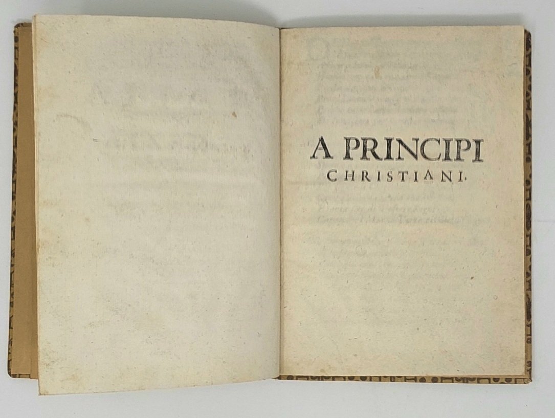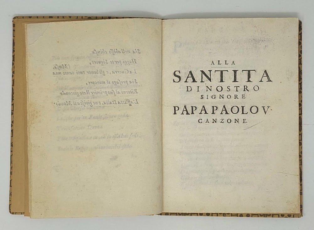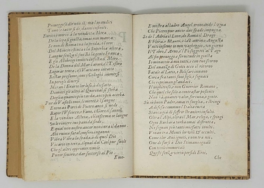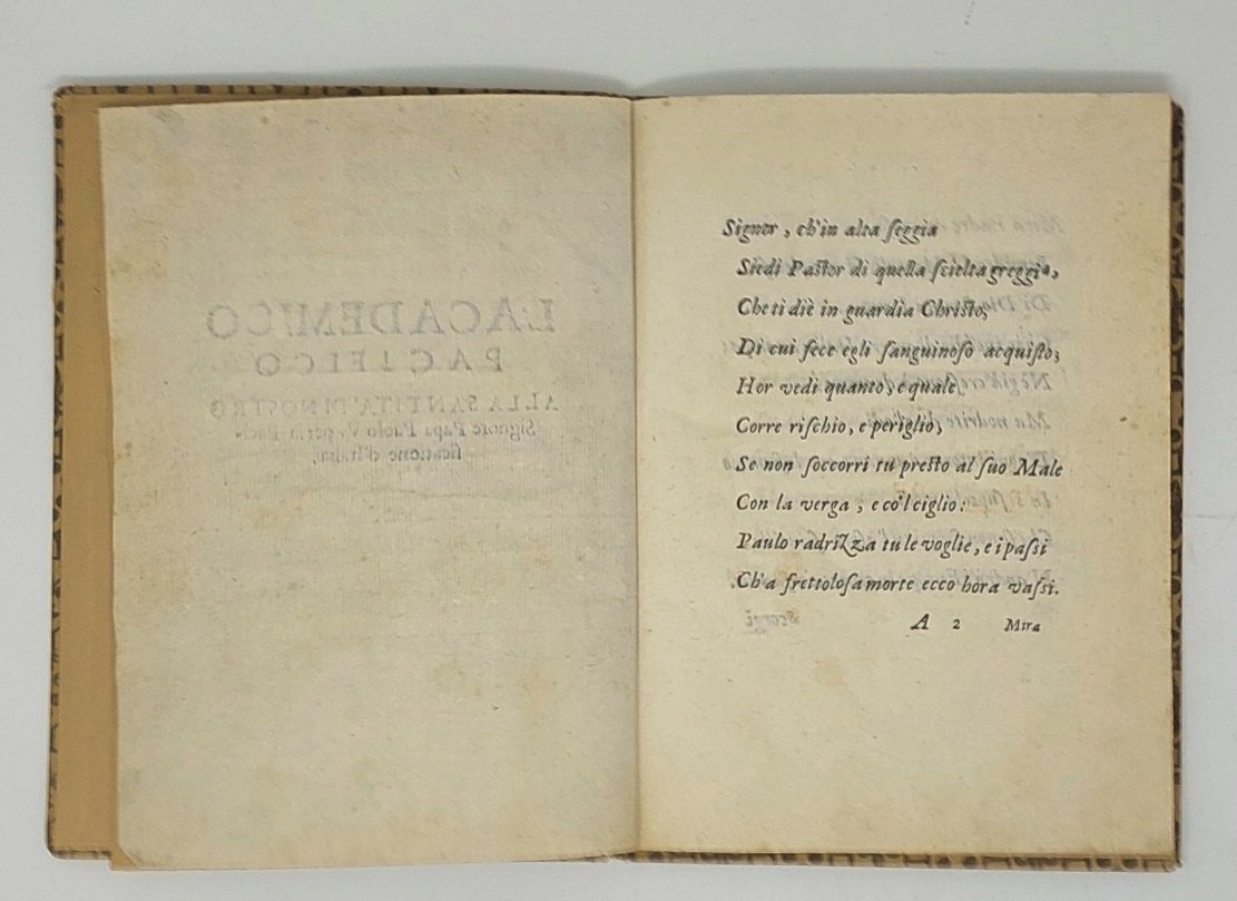 >3 opuscoli in 1 volume in-4 (205x150 mm), cc. 7 (manca l'ultima bianca); cc. 4 (di cui l'ultima bianca); cc. 4. Legatura posteriore cartonato decorato. Insieme di rari opuscoli anonimi composti in versi: i primi due dedicati a Papa Paolo V, e quindi databili tra il 1605 e il 1621, il terzo intorno al 1630 (cfr. Opac SBN) e probabilmente ascrivibile al quarto periodo della Guerra dei Trent'anni, quello italiano (1628-1631). L'argomento comune è l'accorato appello alla pace e alla difesa dell'Italia. Ottimo esemplare, assai fresco (strappo all'angolo superiore della prima opera, carta B3).