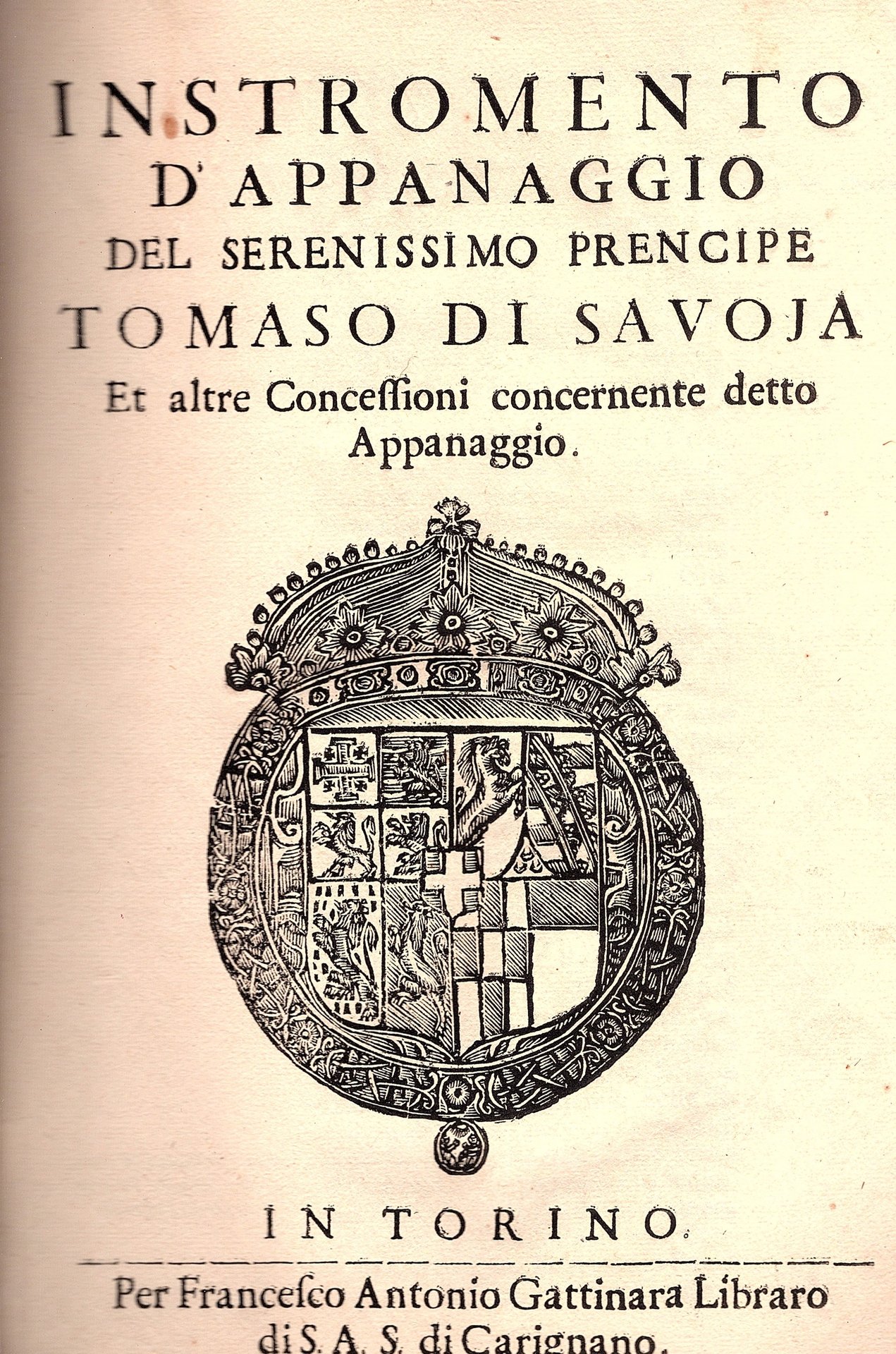 In-folio (32x23), brossura coeva muta legata con filo. Pp (4), 58, 23, (1), grande stemma xilografico dei Savoia al frontespizio. Nitidamente stamapato su carta forte in colonna singola centrata con glosse a stampa ai margini. Al contropiatto anteriore applicati stralci di catalogo librartia antiquari con notizie sul volume. Minimi difetti alla brossura. Bruniture alla pp 19-22 peraltro ottimo e genuino esemplare ad ampi margini. Non comune edizione originale dell'elenco delle assegnazioni di terre di cui beneficiava il principe Tommaso Francesco di Savoia (1596-1656): Racconigi, Villafranca, Cavalermaggiore, Vigone, Caselle, Barge. Seguono patenti regie.