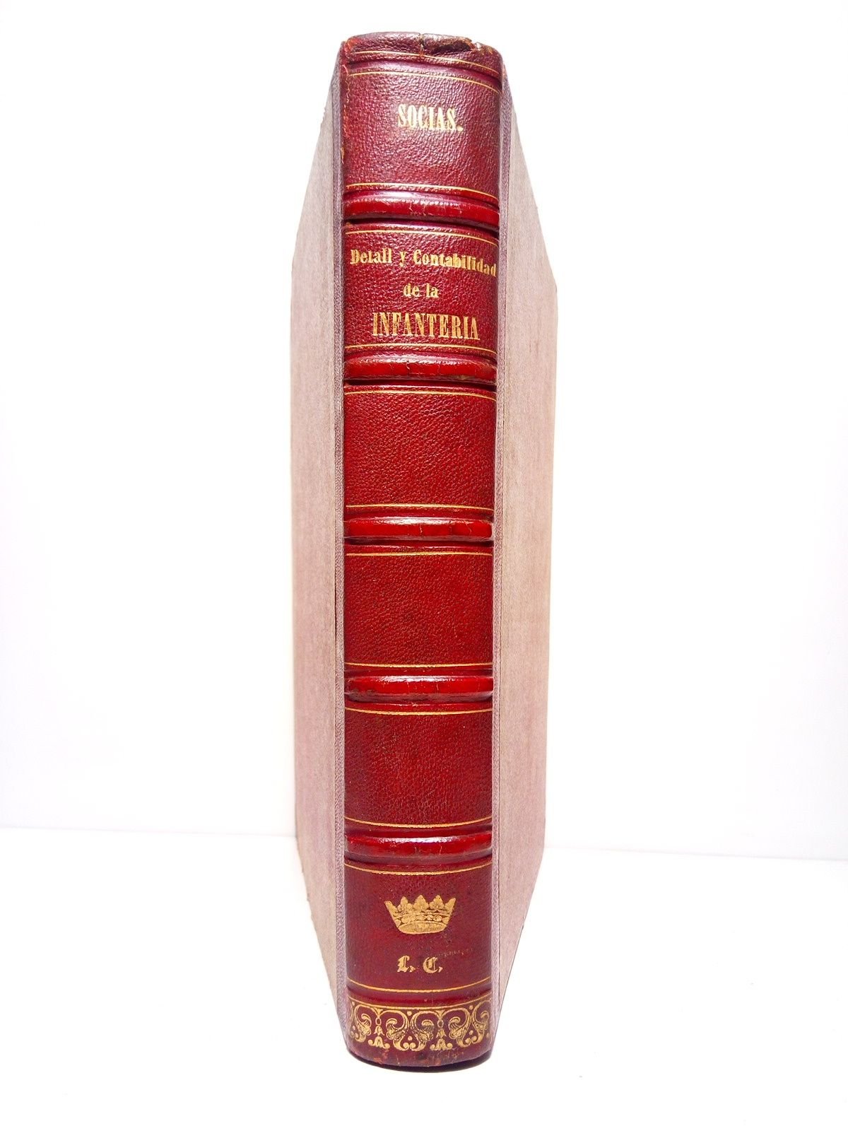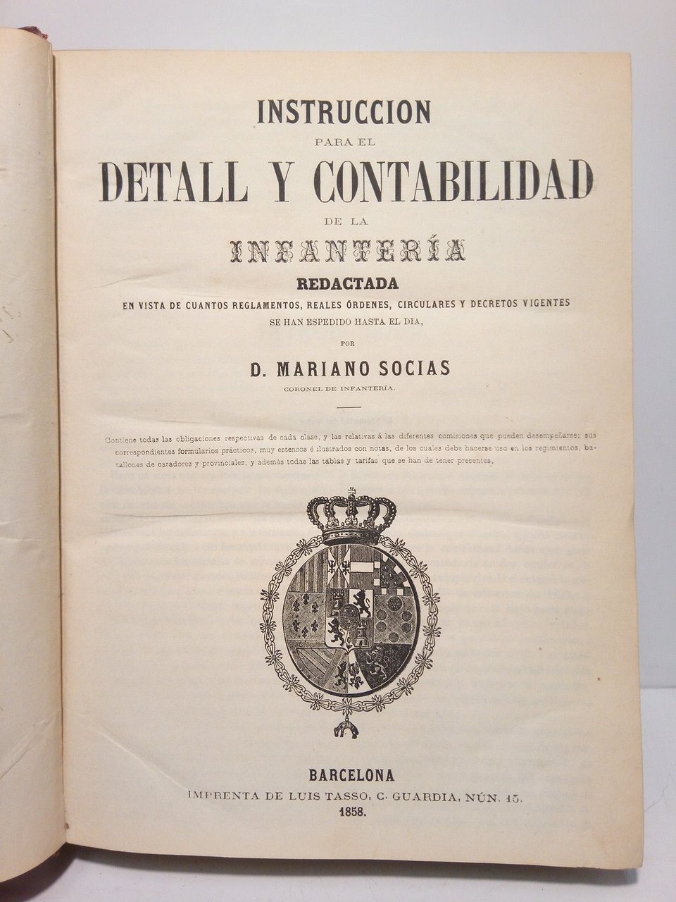 Barcelona: Imprenta de Luis Tasso, 1858.- 247 p. + 676 p. de formularios y estados; 4º mayor (29 x 22 cm); Media Piel chagrén época, lomo dorado con corona, iniciales y greca al pie.- RARO libro que es en sí, el primer tratado completo de contabilidad militar impreso en España.* Los cantos de las tapas y las esquinas con rozaduras y pequeños deterioros diversos, pero restaurados en lo posible. Interior impecable. EJÉRCITO Y TEMAS MILITARES