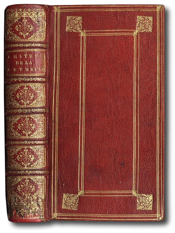 >in-8 piccolo (156x92mm). Con 6 tavole fuori testo a piena pagina incise in rame, bruniture. Legatura coeva in marocchino rosso, decorazione in oro, piatti inquadrati da duplice cornice di triplice filetto, agli angoli esterni della cornice interna graziosi vasi di fiori stilizzati, dorso a 5 nervi, comparti riccamente decorati in oro con motivi fitomorfi, tagli dorati, (piccoli restauri e fori di tarlo al dorso, cuffia inferiore rifatta). Astuccio. La legatura rappresenta il tipico esempio di legatura definita alla Du Seuil, legatore del re durante la reggenza di Filippo d'Orleans.